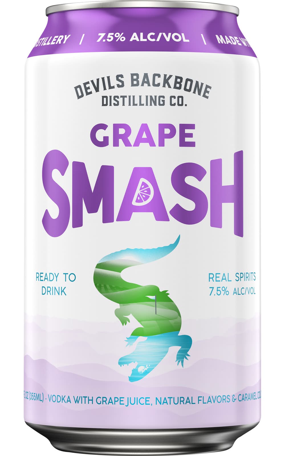 Devils Backbone Distilling Company SMASH Cocktails presents Grape Smash. Grape Smash is a canned cocktail with a 7.5% ABV. Grape Smash pairs best with early morning tee-times and perfecting your newest trick shot. We craft this cart-ready bevvy with premium vodka, Concord grape juice, a squeeze of lime, and a bubbly ginger ale finish. Smash it whenever you need a transfusion of flavor in your day, whether you're putting for par or putting through that little windmill. Fore! 4-pack of 12 oz cans. Alcohol by volume: 10%