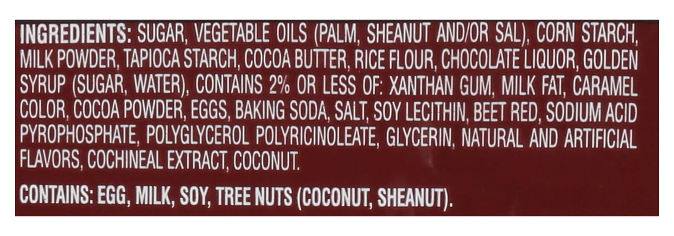 Sugar, Vegetable Oils (Palm, Sheanut and/or Sal), Corn Starch, Milk Powder, Tapioca Starch, Cocoa Butter, Rice Flour, Chocolate Liquor, Golden Syrup (Sugar, Water), Contains 2% or Less of: Xanthan Gum, Milk Fat, Caramel Color, Cocoa Powder, Eggs, Baking Soda, Salt, Soy Lecithin, Beet Red, Sodium Acid Pyrophosphate, Polyglycerol Polyricinoleate, Glycerin, Natural and Artificial Flavors, Cochineal Extract, Coconut Contains: Eggs, Milk, Soybeans, Tree Nuts, Coconuts, Tree Nuts, Sheanuts
