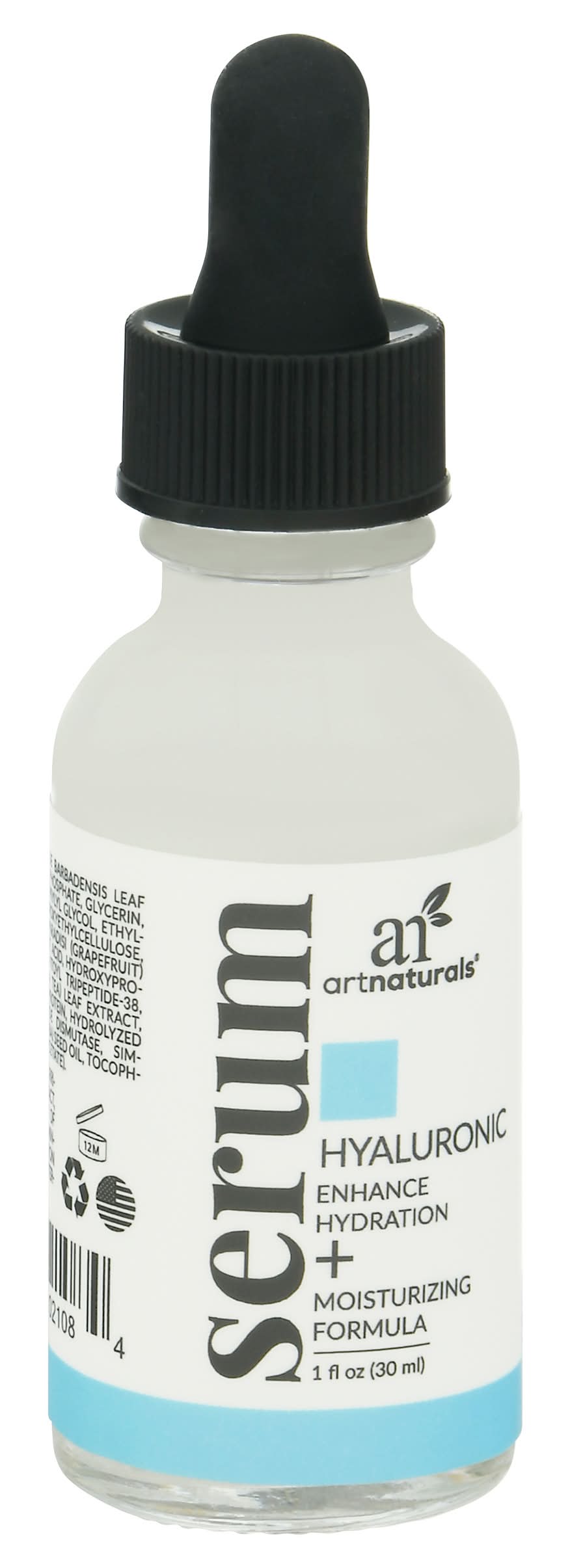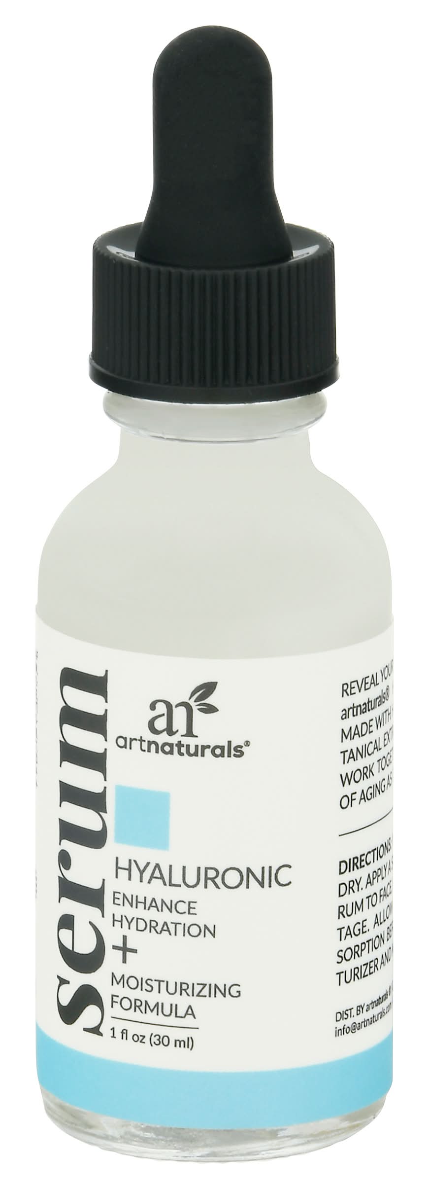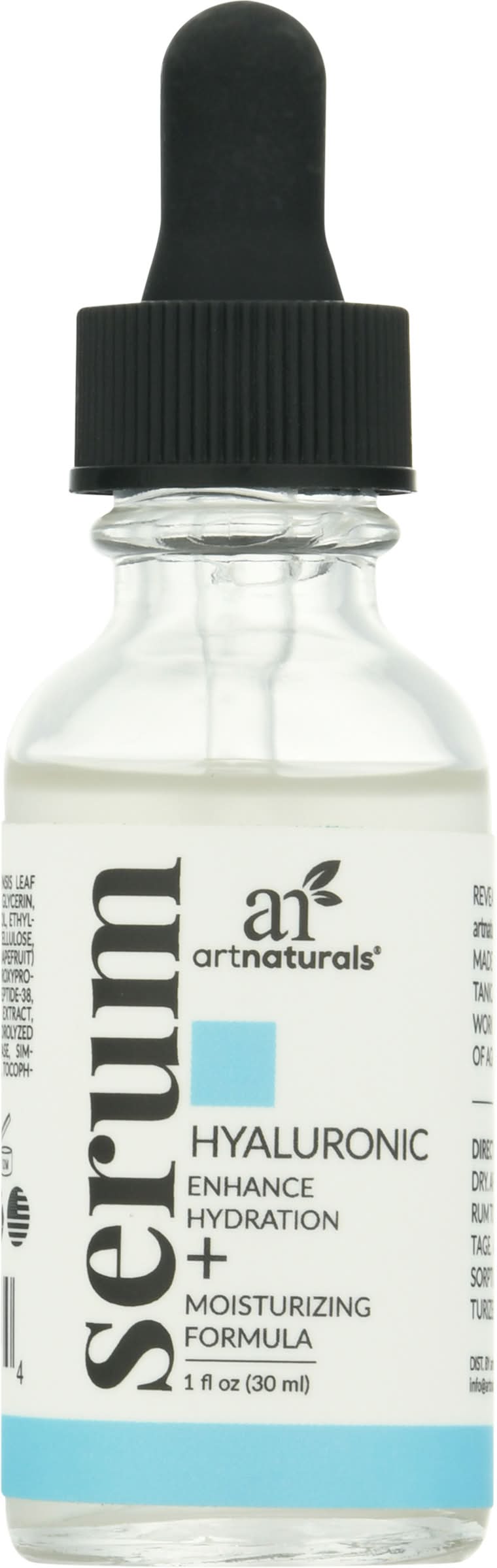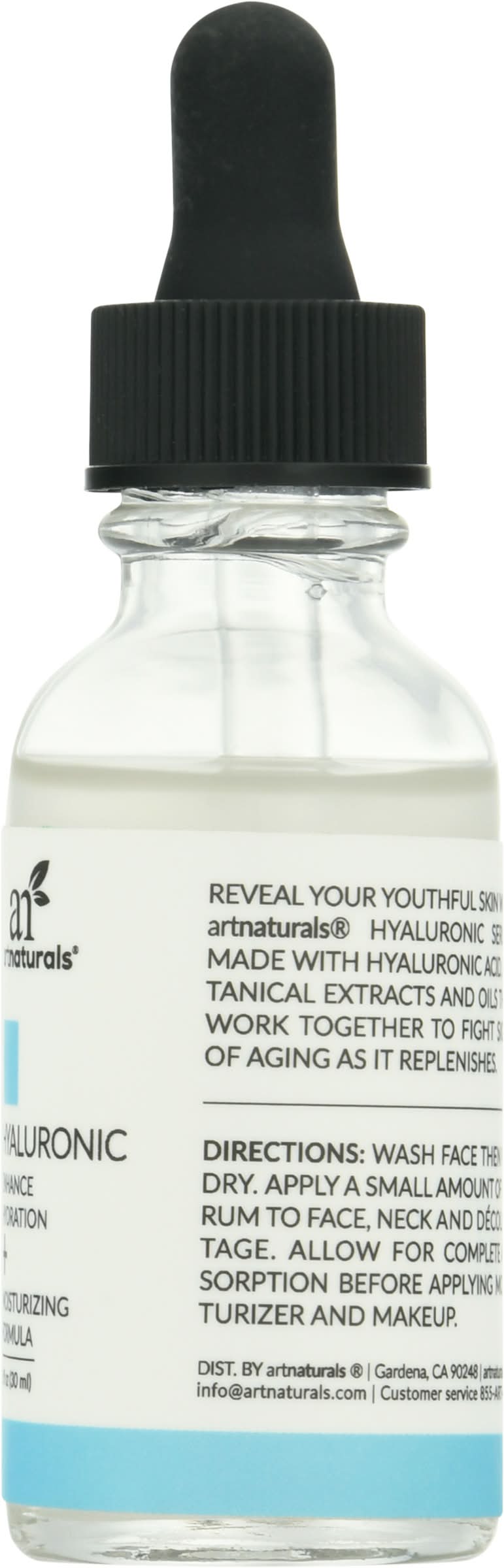 Enhance hydration + moisturizing formula. Reveal your youthful skin with ArtNaturals Hyaluronic Serum. Made with hyaluronic acid, botanical extracts and oils that work together to fight signs of aging as it replenishes. artnaturals.com. Customer Service: 855-Art-4488. Made in USA. • Artnaturals, Gardena, CA, 90248 • Packaging: Reusable