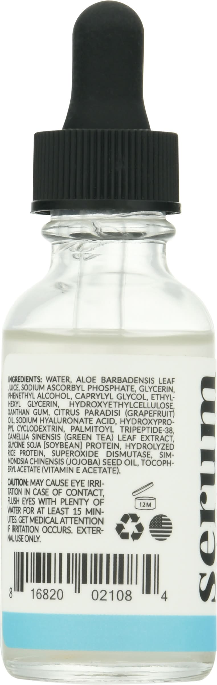 Ingredients: Water, Aloe Barbadensis Leaf Juice, Sodium Ascorbyl Phosphate, Glycerin, Phenethyl Alcohol, Caprylyl Glycol, Ethylhexyl Glycerin, Hydroxyethylcellulose, Xanthan Gum, Citrus Paradisi (Grapefruit) Oil, Sodium Hyaluronate Acid, Hydroxypropyl Cyclodextrin, Palmitoyl Tripeptide-38, Camellia Sinensis (Green Tea) Leaf Extract, Glycine Soja [Soybean] Protein, Hydrolyzed Rice Protein, Superoxide Dismutase, Simmondsia Chinensis (Jojoba) Seed Oil, Tocopheryl Acetate (Vitamin E Acetate) Contains: Soybeans