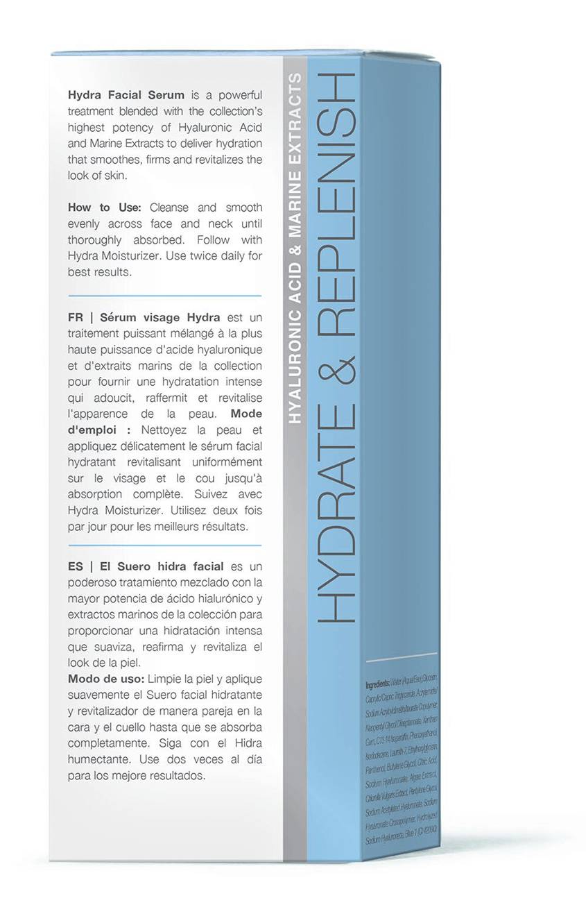 Hydrate & Replenish Hydra Facial Serum is a powerful treatment blended with the collection’s highest potency of Hyaluronic Acid and Marine Extracts to deliver intense hydration that smoothes, firms and revitalizes the look of skin.