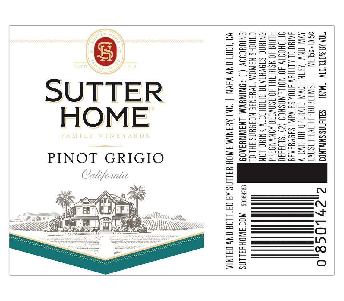 Sutter Home Pinot Grigio White Wine is always a crowd pleaser. Light, crisp and refreshing, this Pinot Grigio wine offers vibrant tropical fruit flavors and vivid acidity with a clean finish. Delicate floral notes mingle with ripe pear, peach and melon on the nose, leading to bright citrus, white peach and tropical fruit flavors. Sutter Home Wine has earned Silver from 2023 Toast of the Coast Wine Competition and 90 points-Gold from 2020 San Diego International. Serve this fruit-forward dry white wine for a variety of occasions. As you gather around the table this holiday season, enjoy Sutter Home wine in your favorite wine glasses with mashed potatoes, chicken, turkey, stuffing and all the pumpkin & apple pies. Or get cozy around the fireplace and warm up while enjoying a glass of wine. Sutter Home wines is the perfect holiday gift. Whether you gift wine as a stocking stuffer, to your neighbor across the street, or serve at your own holiday table. • Pack size: 4 • Alcohol by volume: 13.1% • Packaging: Reusable
