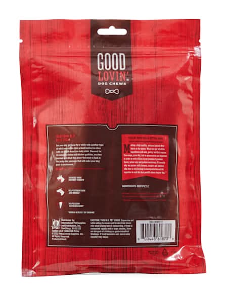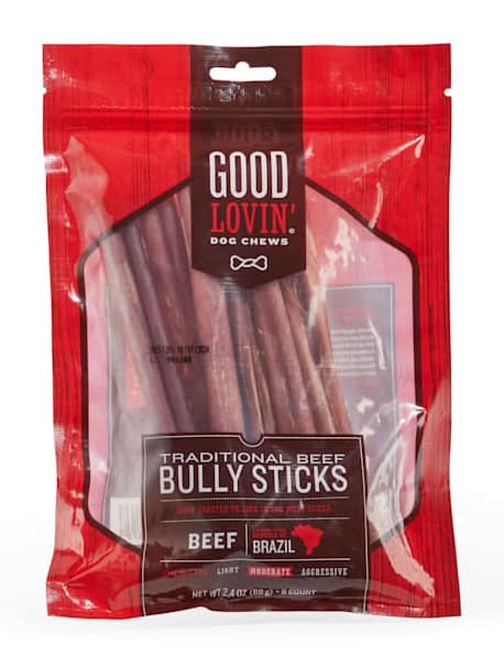 The Good Lovin' Traditional Beef Bully Stick Dog Chew dishes out delightful meaty flavor and an entertaining outlet for moderate chewers. Sourced from the ranches of South America, this classic treat helps to keep your pup's teeth and gums clean. • Pack size: 6 • Size: 0.62 lb