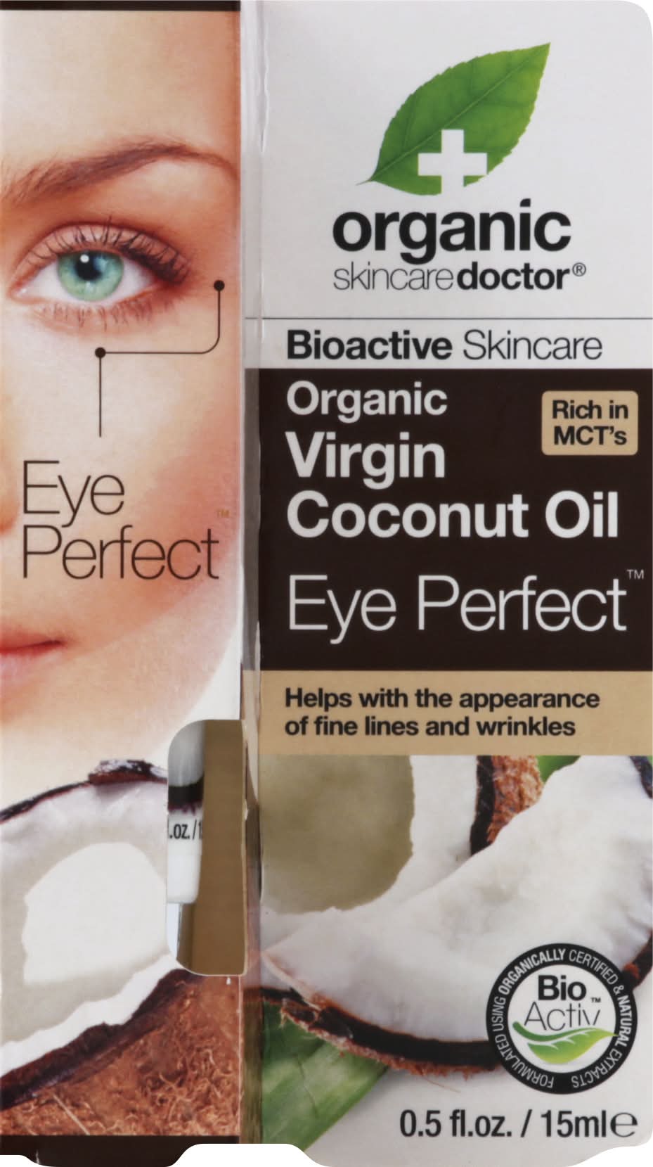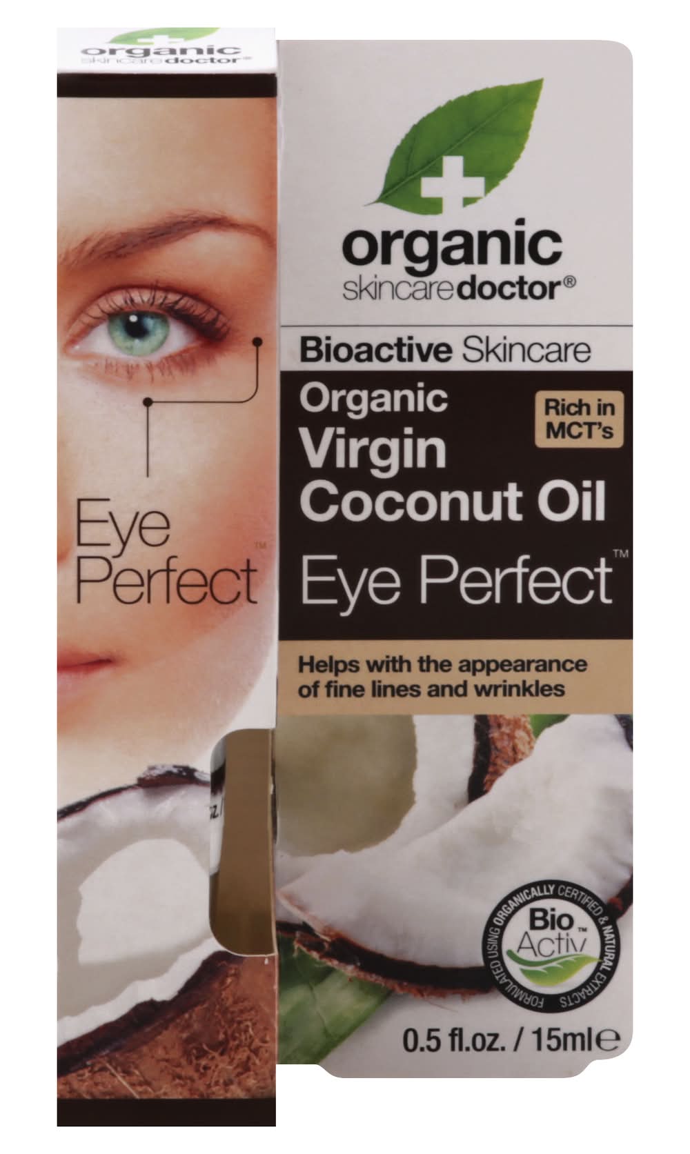 Bioactive skincare. Rich in MCT's. Helps with the appearance of fine lines and wrinkles. Formulated using organically certified & natural extracts. Using a balanced formulation of organic virgin coconut oil, marine actives and our proprietary blend of natural organic oils and extract, we have created an eye line cream that helps with the appearance of crow's feet, furrows and fine lines. Eye Perfect also works to hydrate and smooth the delicate areas around the eyes for a satiny soft, youthful tone. Organic and natural bioactive ingredients: Coconut oil (Organic); Coconut fruit extract (Organic); Aloe vera leaf juice (Organic); Papaya fruit extract (Organic); Mango fruit extract (Organic); Cocoa seed extract (Organic); Mangosteen fruit extract (Organic); Fig fruit extract (Organic); Orange peel oil (Natural); Bergamot fruit oil (Natural); Lemon peel oil (Natural). Free From: parabens, synthetic colors, phthalates, petrolatum, glycols, isothiazolinones, SLS, mineral oil, silicones, DEA, BHT. All our products are formulated using 70%-100% organic ingredients (Excluding water and salt). Due to the ingredients natural origin, color and consistency may vary from batch to batch. This does not affect the quality of the product. Quality assured. www.organicdoctor.us.com. Do not litter. Made in the EU. Dr Organic,