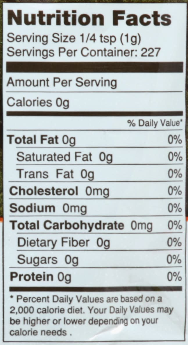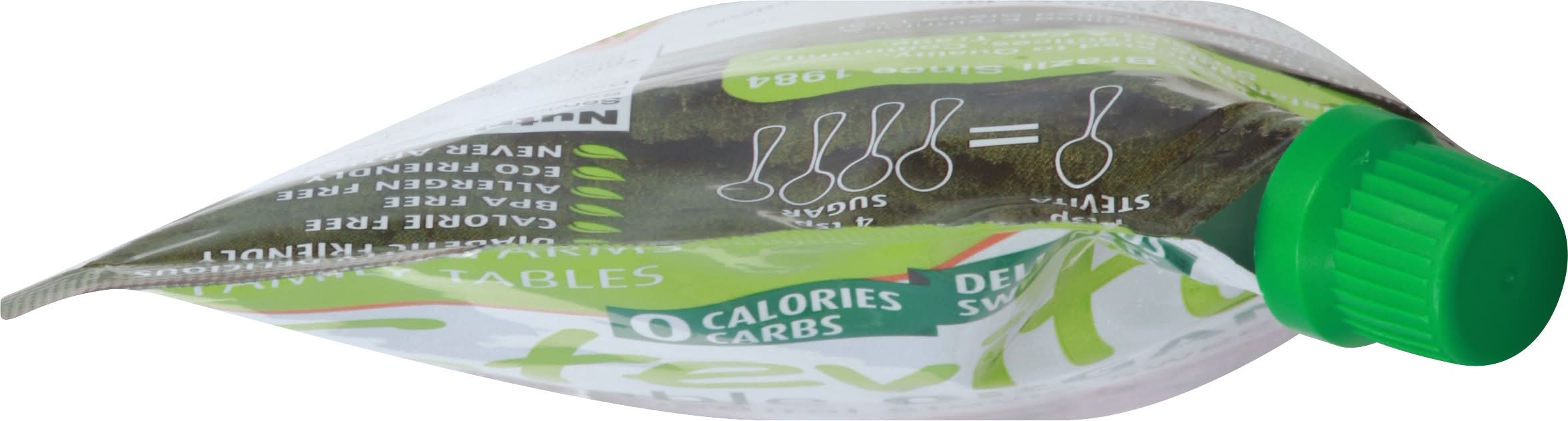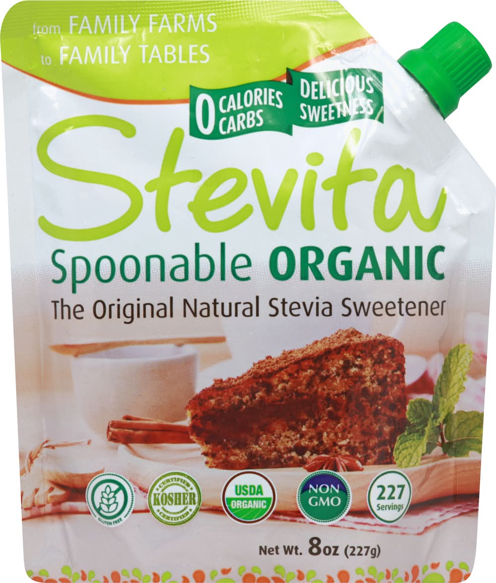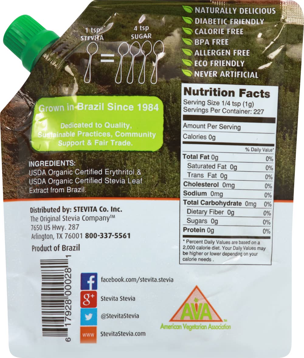0 calories. 0 carbs. Gluten Free. Kosher Certified. USDA Organic. Allergen Free. Diabetic friendly. Calorie free. American Vegetarian Association. Non-GMO. 227 servings. From family farms to family tables. Delicious Sweetness. 1 tsp Stevita = 4 tsp sugar. Naturally Delicious. Never artificial. Dedicated to quality, sustainable practices, community support & fair trade. www.StevitaStevia.com. Facebook: facebook.com/stevita.stevia. Google+: Stevita Stevia. Twitter: (at)StevitaStevia. BPA free. Eco friendly. Grown in Brazil since 1984. Product of Brazil.