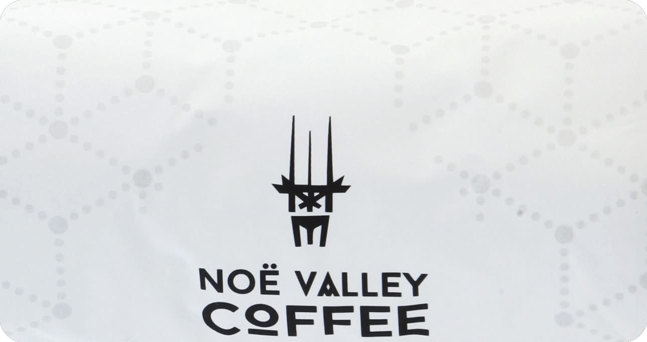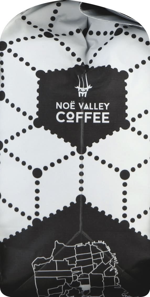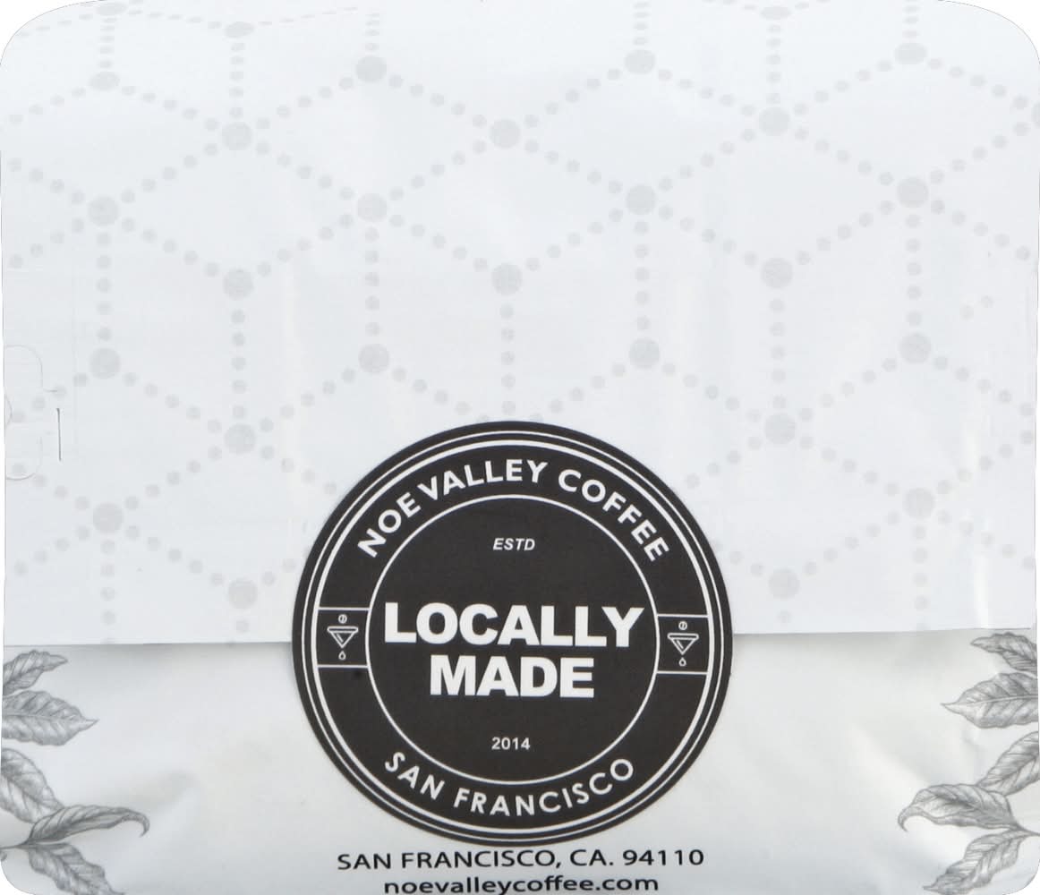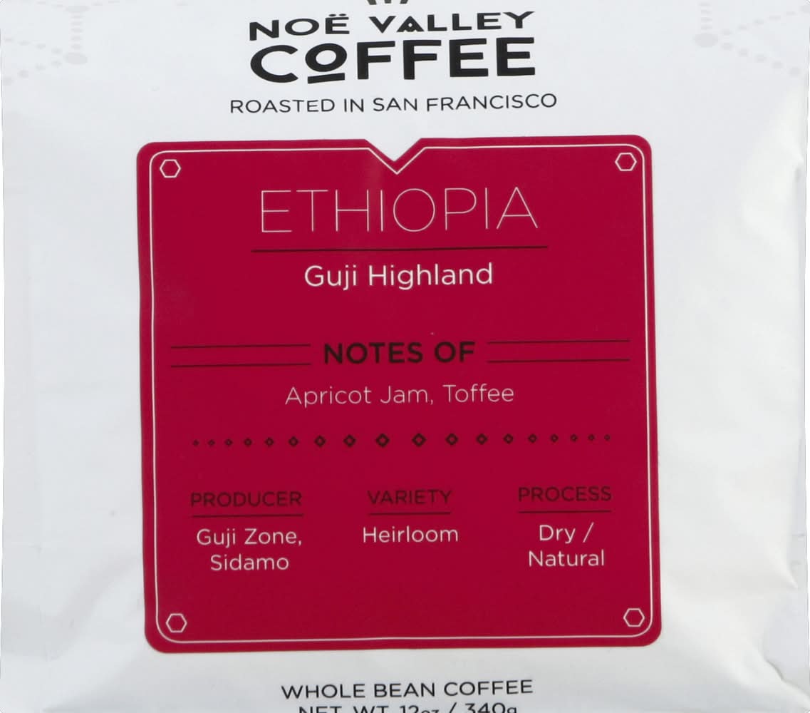 Notes of: apricot jam, toffee. Producer: Guji Zone, Sidamo. Variety: heirloom. Process: dry/natural. Estd. 2014. Locally made. San Francisco. Press to reseal. Scan with your camera. noevalleycoffee.com. (at)noevalleycoffee. Roasted in San Francisco, CA. NOE VALLEY COFFEE,
