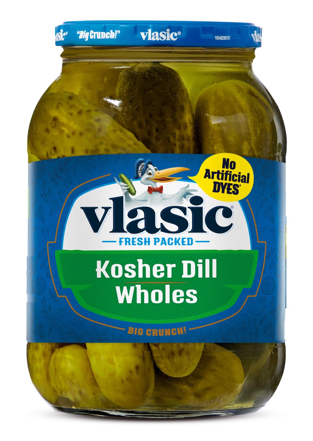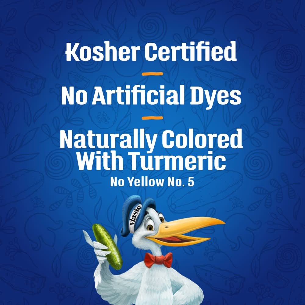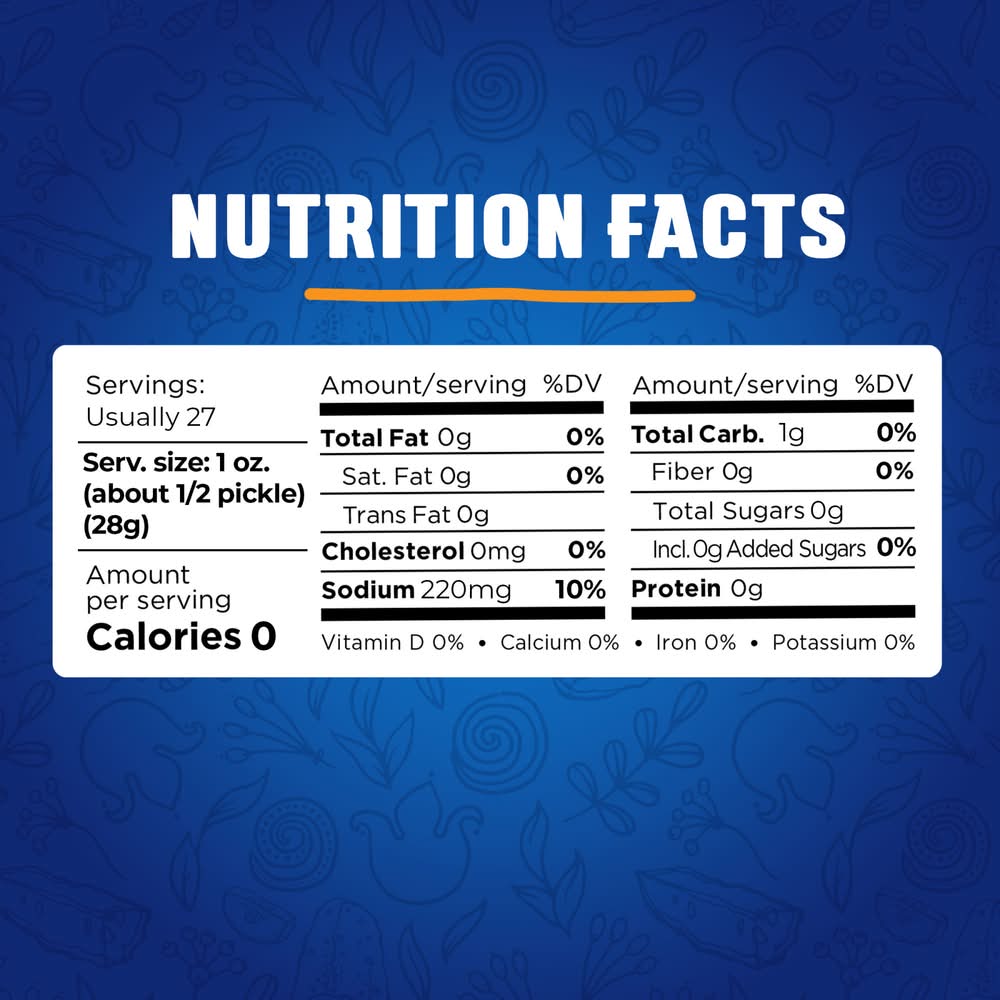 Vlasic Kosher Dill Whole Pickles are deliciously crunchy. All ingredients, along with the Vlasic secret pickling recipe, make these Kosher dill pickles tasty. These snack pickles contain 0 calories per serving and deliver one-of-a-kind crunch your entire family loves. Kosher pickles are ideal for serving alongside hamburgers, hot dogs and sandwiches, or eat them right from the jar as a satisfying snack. Vlasic Kosher Dill Whole Pickles are packed in a resealable 46 fluid ounce jar to keep them crunchy and delicious. Vlasic offers several flavors and sizes of pickles, peppers and relish. Keto Friendly: 1g net carbs (1g total carbs minus 0g dietary fiber), and 0g added sugar per serving. • Conagra Brands, PO Box 3534, Chicago, IL, 60654 • Packaging: Reusable