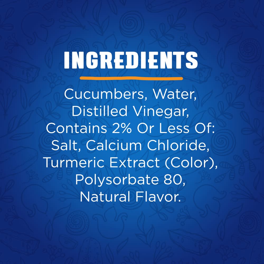 Ingredients: INGREDIENTS: CUCUMBERS, WATER, DISTILLED VINEGAR, CONTAINS 2% OR LESS OF: SALT, CALCIUM CHLORIDE, TURMERIC EXTRACT (COLOR), POLYSORBATE 80, NATURAL FLAVOR.