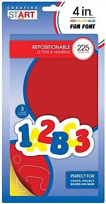 Creative Start® Peel and stick letters and numbers in red blue and yellow. Decorate your projects with these bright block letters. Peel and stick for quick application. Letters are easy to read. Includes 225 letters and numbers. - 4 - Block Font - Red, Blue and Yellow