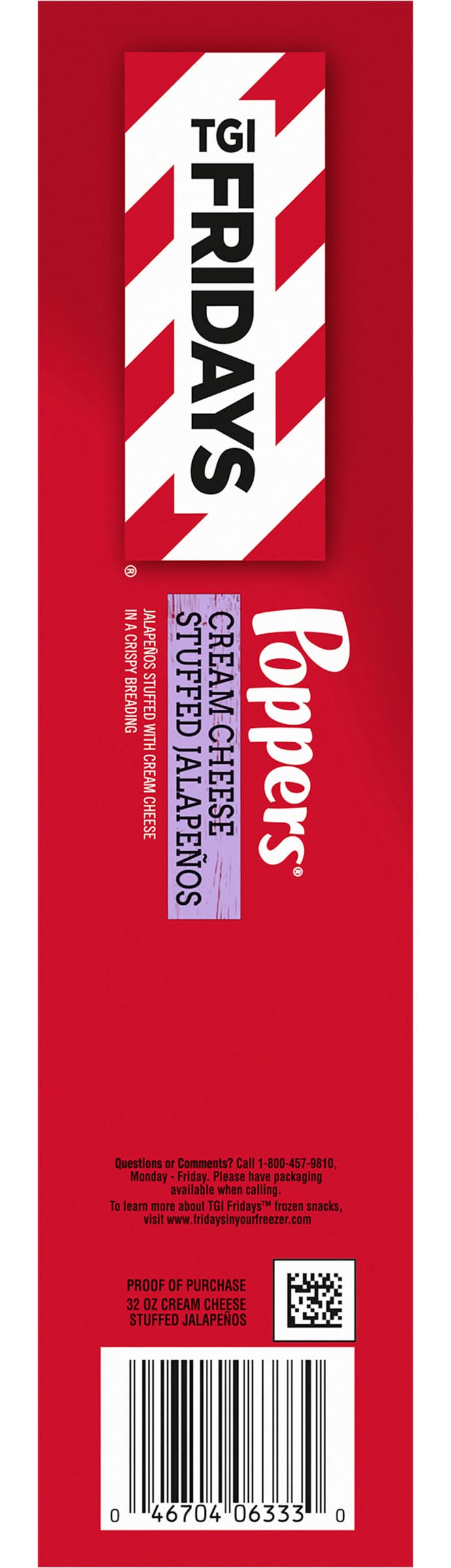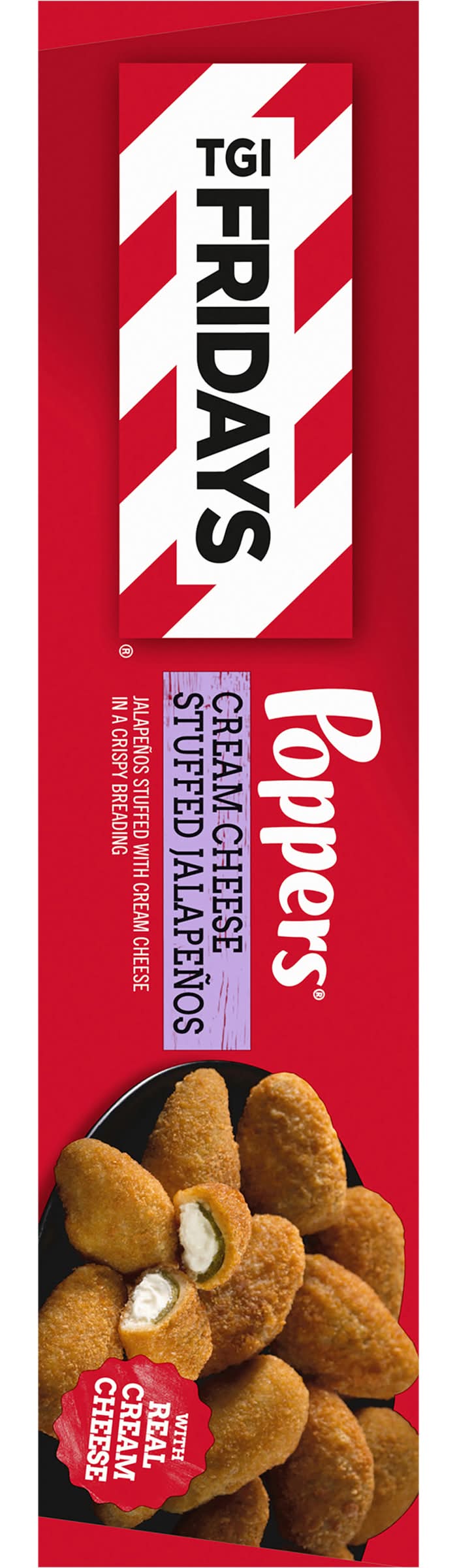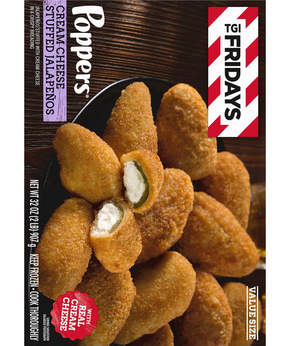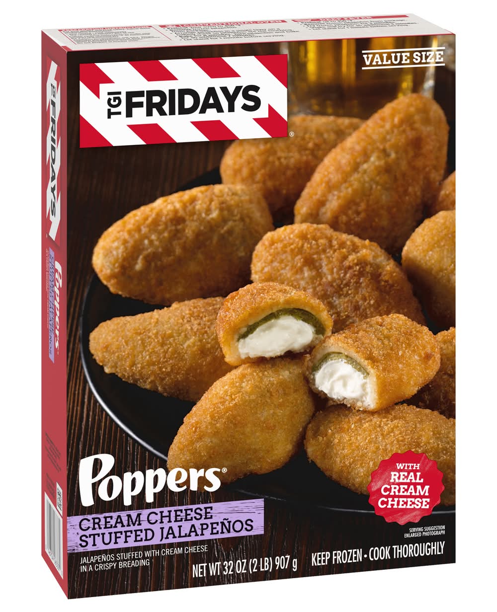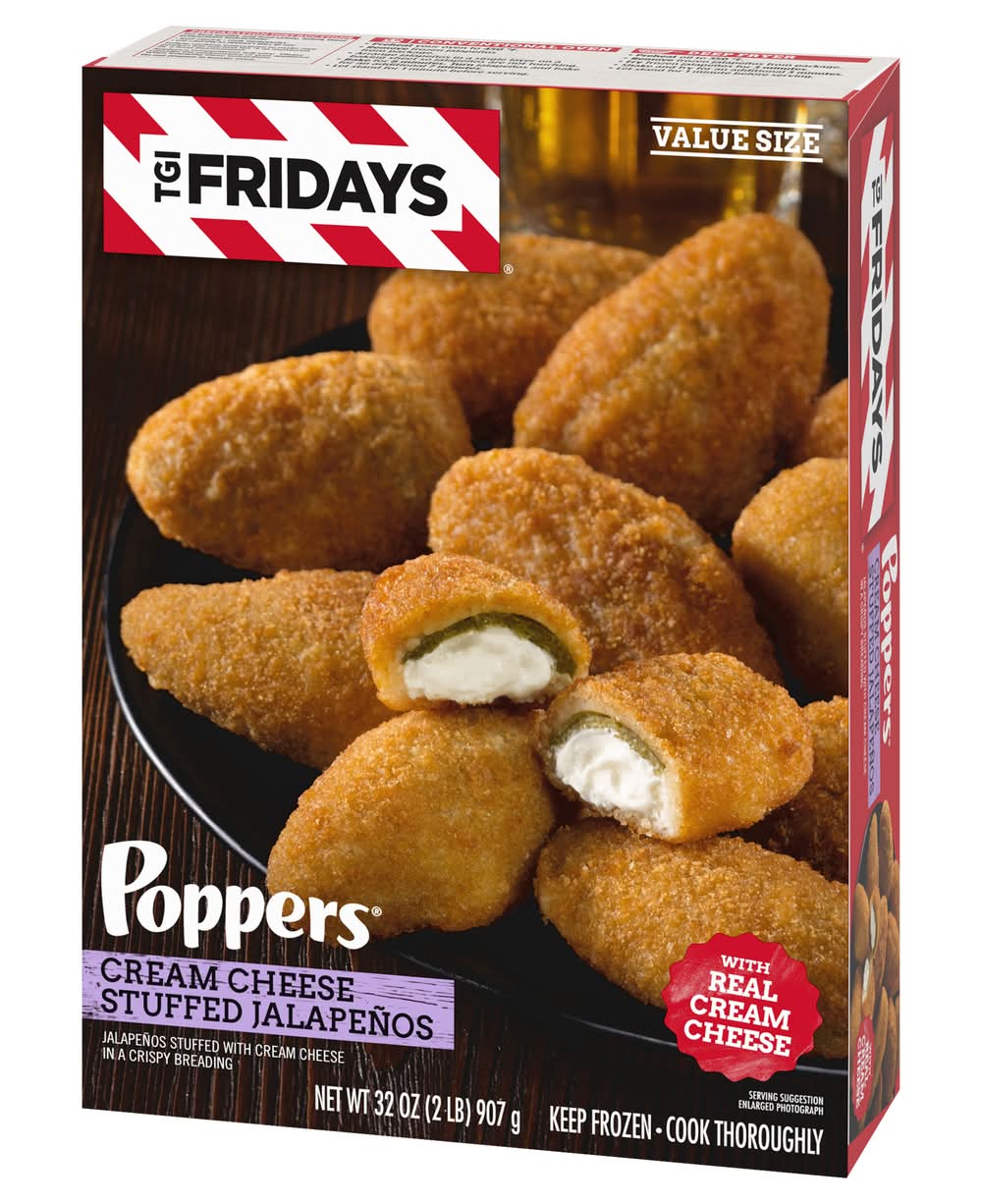 Enjoy your TGI Fridays menu favorites at home with our easy restaurant style appetizers. Ready to heat, TGI Fridays Cream Cheese Stuffed Jalapeno Poppers are a quick and delicious appetizer or party food. Our TGIF crispy breaded jalapeno poppers are stuffed with real cream cheese. Packaged in a box for convenient storage, you can heat our jalapeno poppers in a conventional oven or deep fryer. Store our 32-ounce box of cream cheese stuffed jalapeno poppers in the freezer until ready to prepare. Whether you’re craving jalapeno poppers, potato skins, spinach artichoke dip, chicken bites and wings, mozzarella sticks or sliders, TGI Fridays has frozen appetizers the whole family will enjoy. Kraft Heinz Foods Company, Pittsburgh, PA, 15222, Ph: 800-457-9810