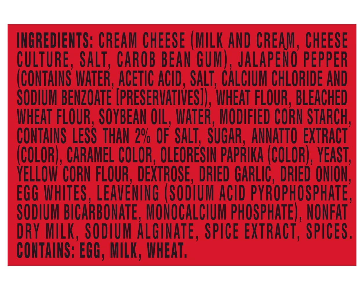CREAM CHEESE (MILK AND CREAM, CHEESE CULTURE, SALT, CAROB BEAN GUM), JALAPEO PEPPER (CONTAINS WATER, ACETIC ACID, SALT, CALCIUM CHLORIDE AND SODIUM BENZOATE [PRESERVATIVES]), WHEAT FLOUR, BLEACHED WHEAT FLOUR, SOYBEAN OIL, WATER, MODIFIED CORN STARCH, CONTAINS LESS THAN 2% OF SALT, SUGAR, ANNATTO EXTRACT (COLOR), CARAMEL COLOR, OLEORESIN PAPRIKA (COLOR), YEAST, YELLOW CORN FLOUR, DEXTROSE, DRIED GARLIC, DRIED ONION, EGG WHITES, LEAVENING (SODIUM ACID PYROPHOSPHATE, SODIUM BICARBONATE, MONOCALCIUM PHOSPHATE), NONFAT DRY MILK, SODIUM ALGINATE, SPICE EXTRACT, SPICES. Contains: CONTAINS: EGG, MILK, WHEAT
