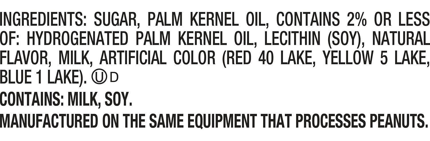 SUGAR, PALM KERNEL OIL, CONTAINS 2% OR LESS OF: HYDROGENATED PALM KERNEL OIL, LECITHIN (SOY), NATURAL FLAVOR, MILK, ARTIFICIAL COLOR (RED 40 LAKE, YELLOW 5 LAKE, BLUE 1 LAKE). Contains: Contains: Soy, Milk