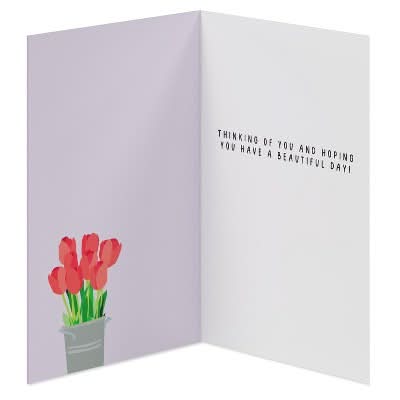 Brighten a friend’s day with this colorful 'Thinking of You' card from American Greetings. Adorned with a delightful illustration of various potted plants, each bearing cheerful blooms, this card sends a warm 'Hello' to someone special. Whether close by or far away, it’s the perfect way to convey affection and keep in touch. Includes a thoughtful internal message suitable for various occasions of friendship. Envelope included.