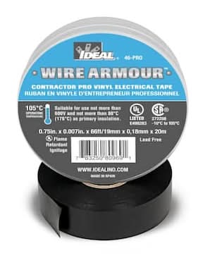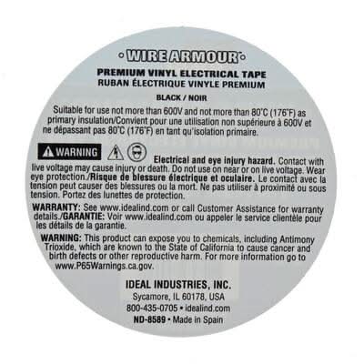 When performance matters, you can count on IDEAL Wire Armour Contractor Pro vinyl electrical tape to insulate and protect, stretch with strength, and bond in the toughest conditions and most critical applications at a great value. Commercial electric vinyl tape with blue core technology that provides high elasticity, that is flame retardant, high UV resistant that is impervious to water, oil, acids, alkalis and a wide variety of corrosive chemicals. Pr Cancer and Reproductive Harm - www.P65Warnings.ca.gov. • Color: Black • Size: 3/4 in X 60 ft X 0.007 in