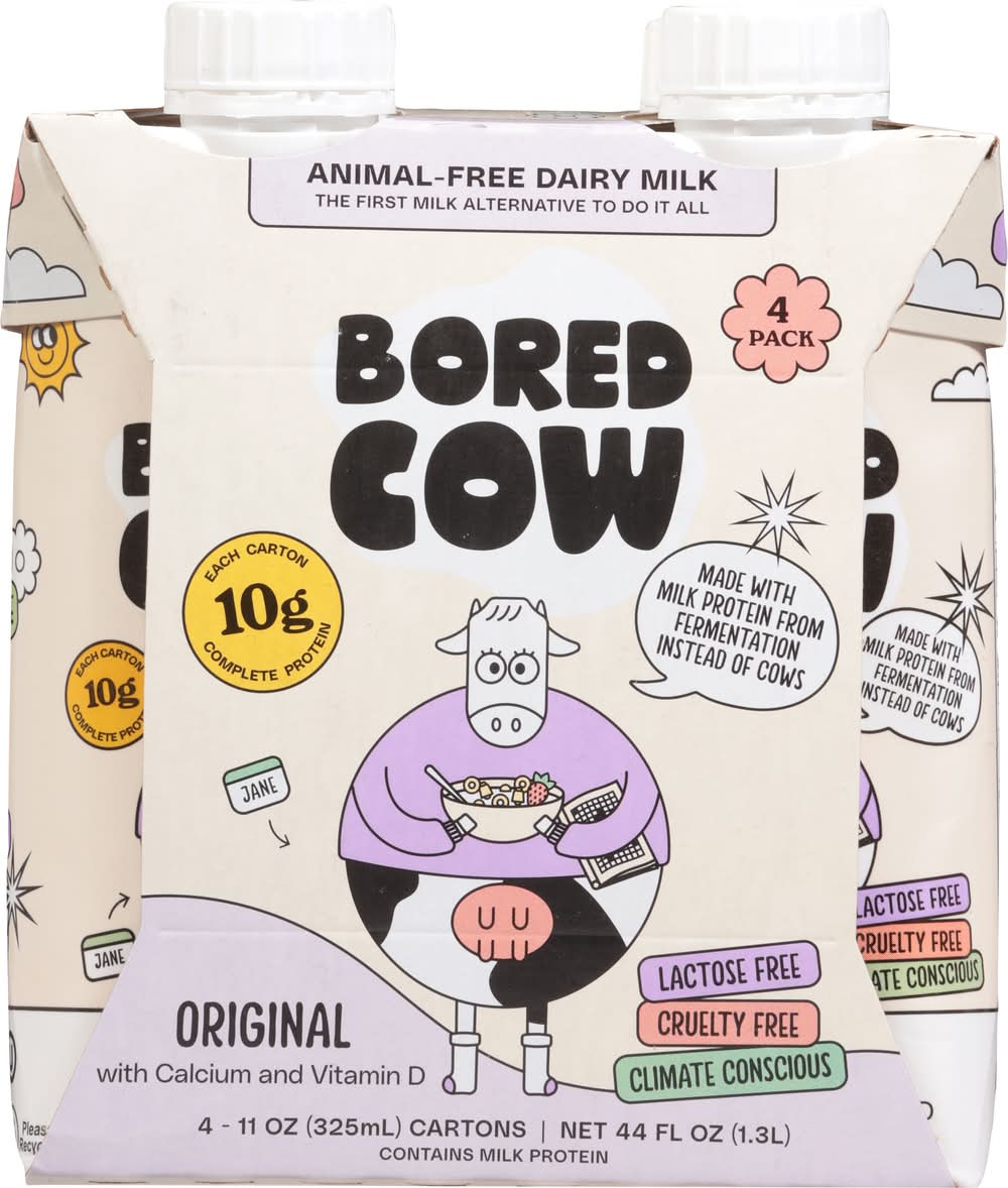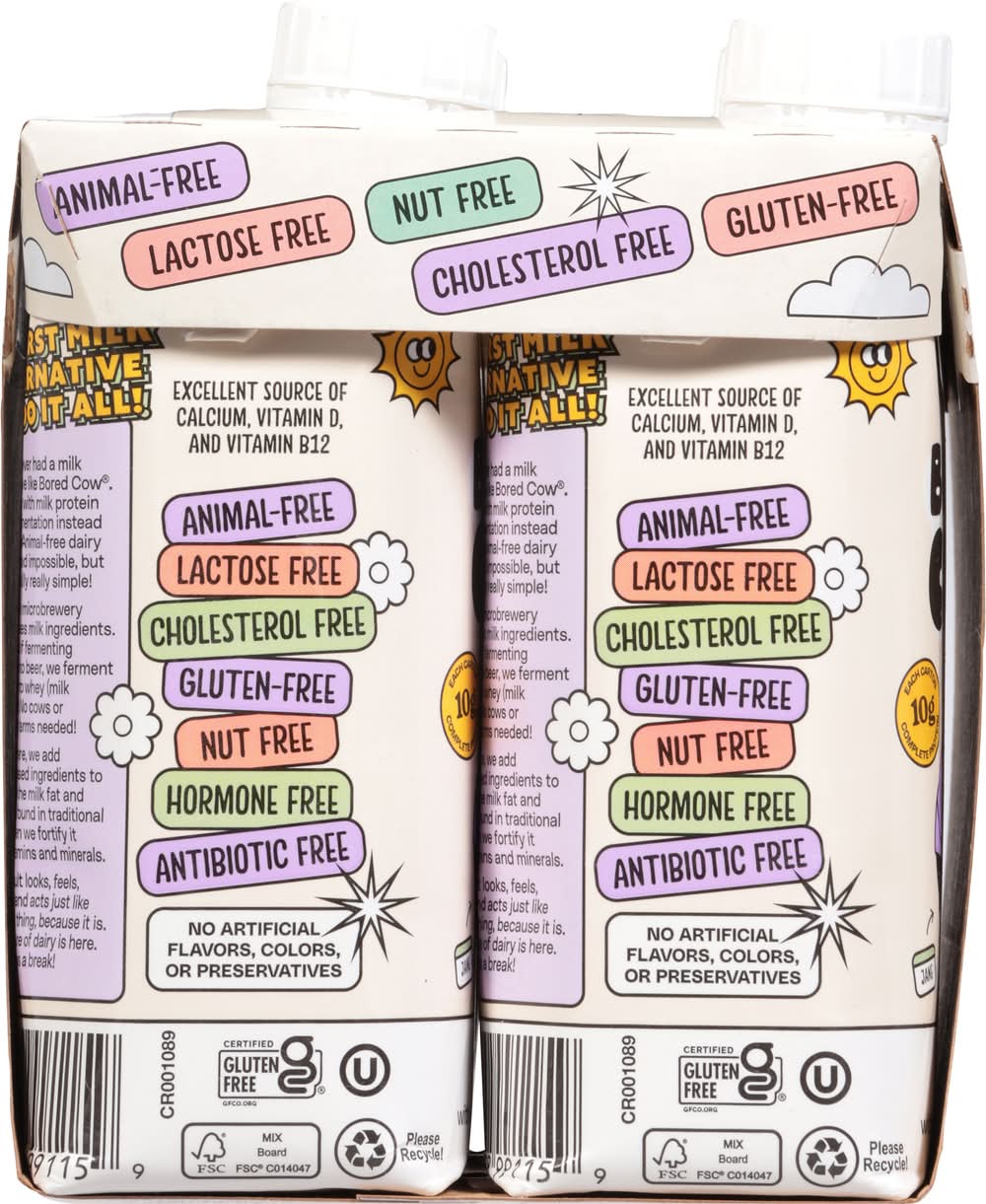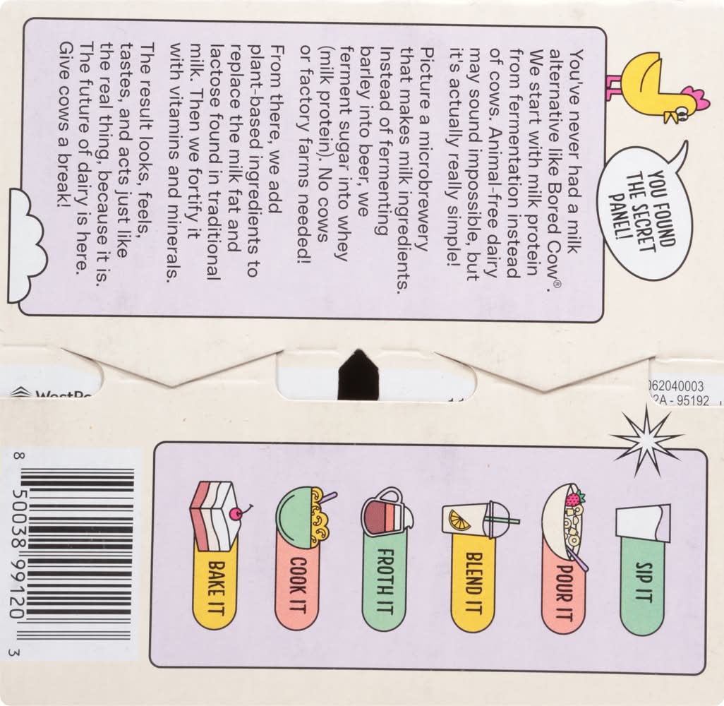 No artificial flavors, colors or preservatives. 10 g complete protein each carton. Certified gluten free. gfco.org. Lactose Free. Cholesterol Free. Nut Free Original with calcium and vitamin D. Excellent source of calcium, vitamin D, and vitamin B12. Animal-free dairy milk the first alternative to do it all. Contains milk protein. For kids and kids at heart. The first milk alternative to do it all! Antibiotic free. Hormone free. You found the secret panel! You've never had a milk alternative like Bored Cow. We start with milk protein from fermentation instead of cows. Animal-free dairy may sound impossible, but It's actually really simple! Picture a microbrewery that makes milk ingredients. Instead of fermenting barley into beer, we ferment sugar into whey (milk protein). No cows or factory farms needed! From there, we add plant-based ingredients to replace the milk fat and lactose found in traditional milk. Then we fortify it with vitamins and minerals. The result looks, feels, tastes, and acts just like the real thing, because it is. The future of dairy is here. Give cows a break! Scan for surprises. Cruelty free. Climate conscious. Animal-free.