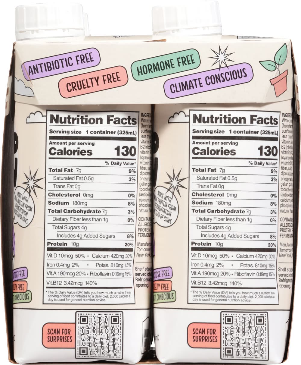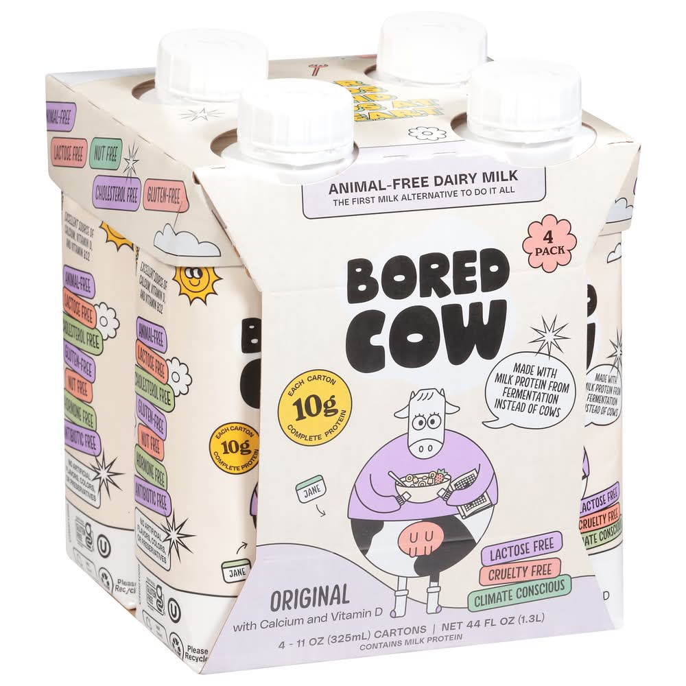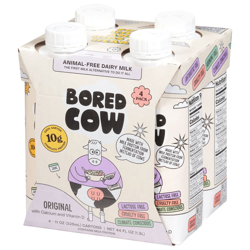 No artificial flavors, colors or preservatives. 10 g complete protein each carton. Certified gluten free. gfco.org. Lactose Free. Cholesterol Free. Nut Free Original with calcium and vitamin D. Excellent source of calcium, vitamin D, and vitamin B12. Animal-free dairy milk the first alternative to do it all. Contains milk protein. For kids and kids at heart. The first milk alternative to do it all! Antibiotic free. Hormone free. You found the secret panel! You've never had a milk alternative like Bored Cow. We start with milk protein from fermentation instead of cows. Animal-free dairy may sound impossible, but It's actually really simple! Picture a microbrewery that makes milk ingredients. Instead of fermenting barley into beer, we ferment sugar into whey (milk protein). No cows or factory farms needed! From there, we add plant-based ingredients to replace the milk fat and lactose found in traditional milk. Then we fortify it with vitamins and minerals. The result looks, feels, tastes, and acts just like the real thing, because it is. The future of dairy is here. Give cows a break! Scan for surprises. Cruelty free. Climate conscious. Animal-free.