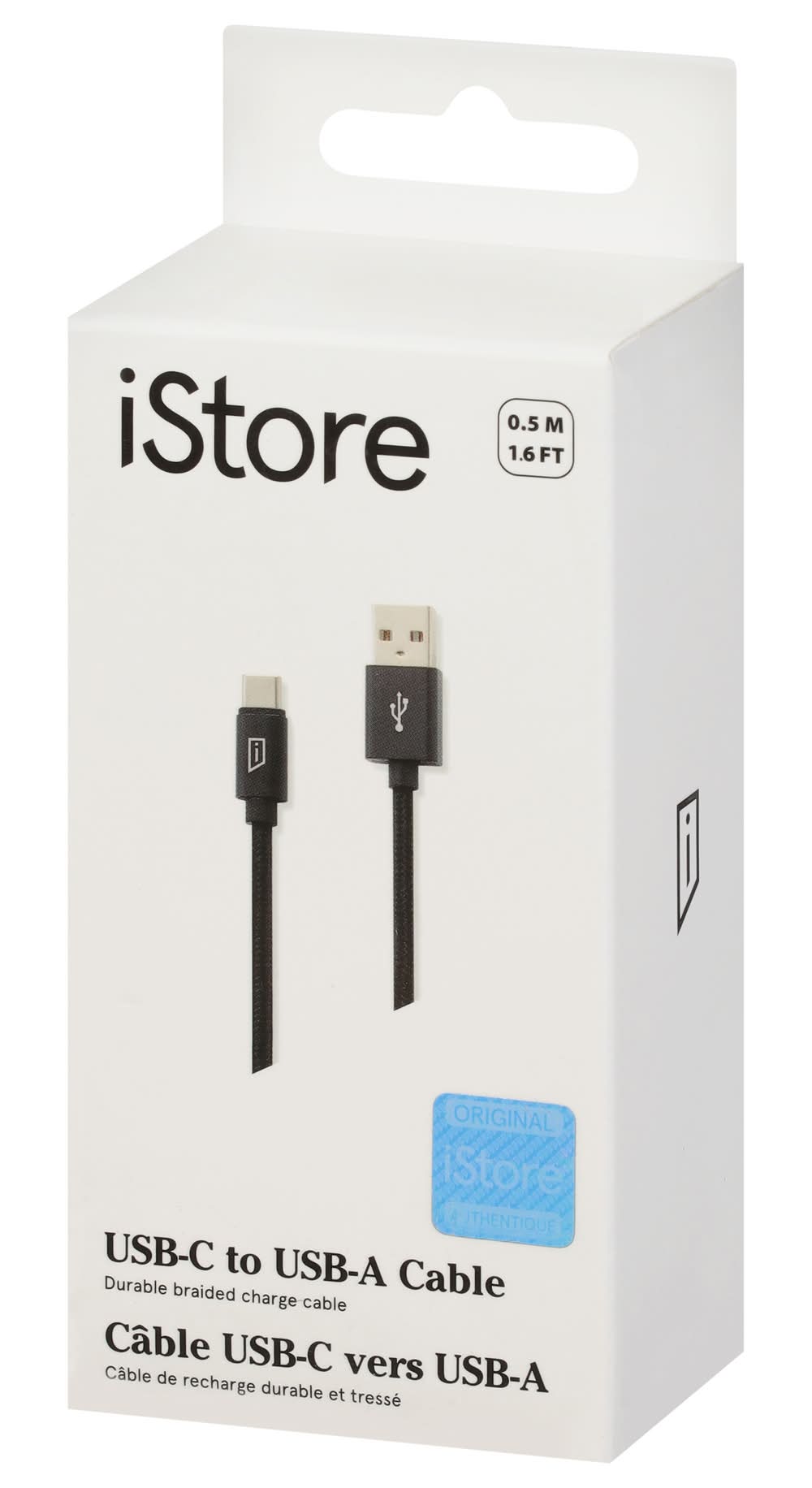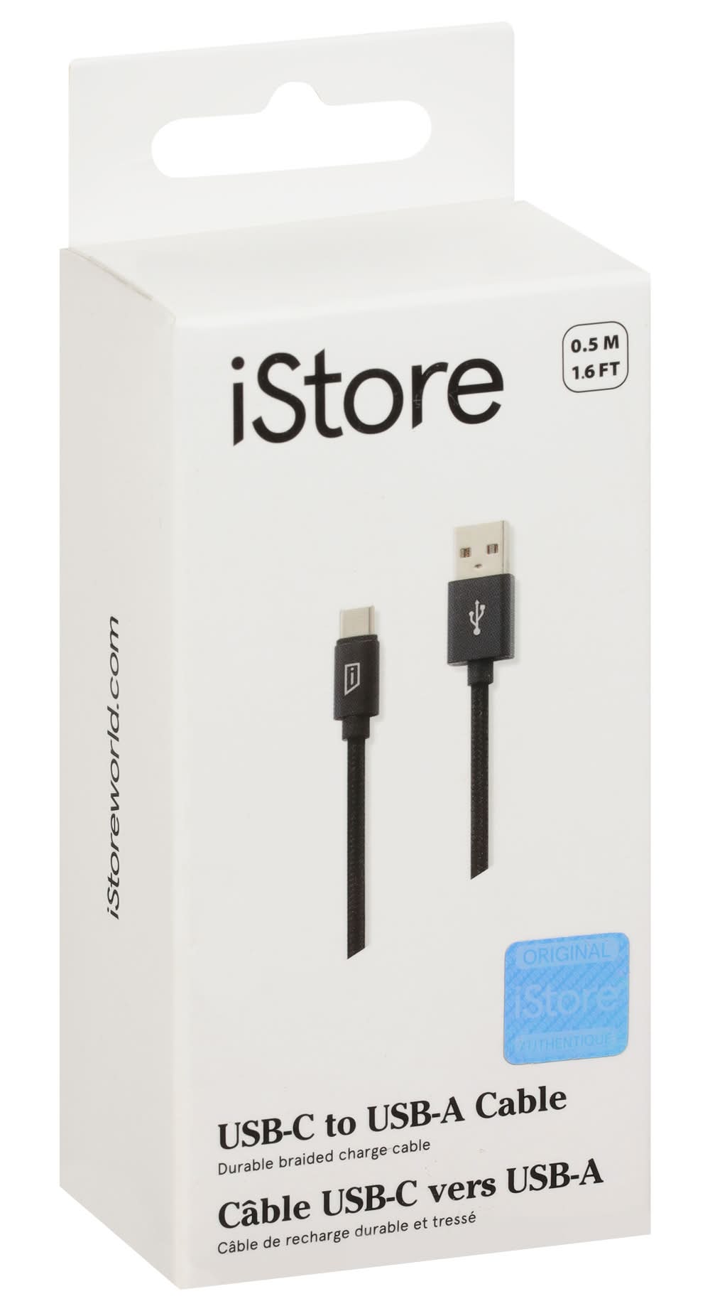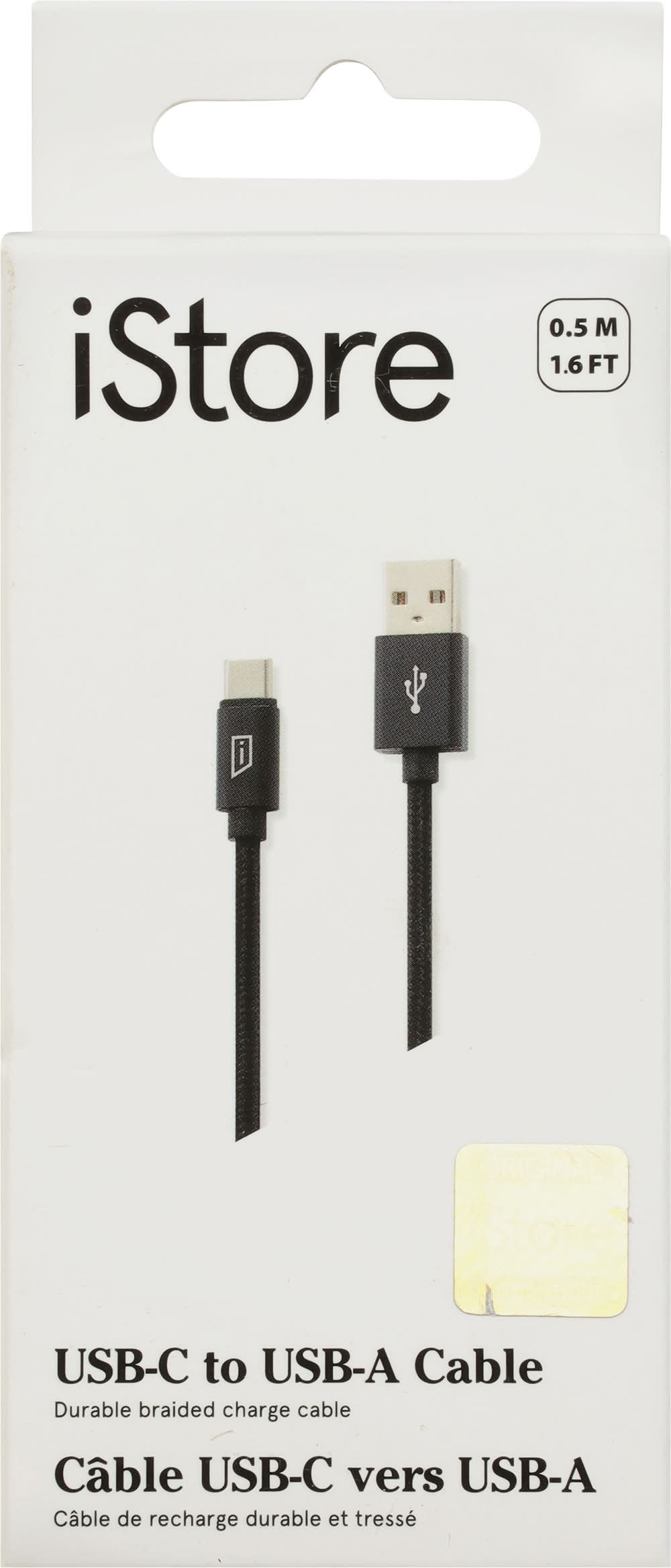 0.5 M (1.6 feet). Durable braided charge cable. 0.5 m (1.6ft)/ Compatible with USB-C devices and accessories. Technical Specifications: USB High-Speed: up to 3A/15W and 480 Mbps data transfer. Original store authentique 1 year warranty. iStoreworld.com. Made in China. iStore,