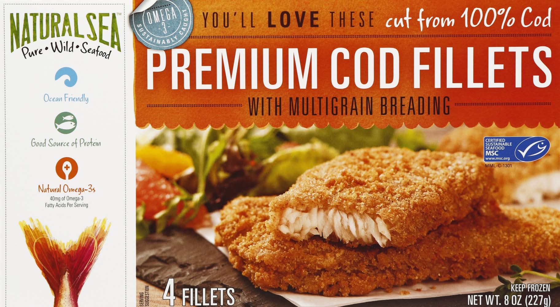 You'll love these. Cut from 100% cod. Omega 3. Sustainably caught. Certified sustainable seafood. MSC. www.msc.org. Pure. Wild. seafood. Ocean friendly. Natural omega-3s. 40 mg of omega-3 fatty acids per serving. These delicious, mild and flaky Natural Sea Premium Cod Fillets contain no fillers, no hydrogenated oils, or preservatives. They are sustainably caught and cut from 100% cod, containing natural omega-3s. Lightly encrusted with our multigrain breading, these premium cod fillets are crispy, tasty, and ready in just 25 minutes. Enjoy! Ocean-friendly: Caught from an MSC certified sustainably fishery. www.msc.org. Good source of protein: 6 g of protein per serving. No fillers. No preservatives. For a full selection of sustainable seafood, visit us at naturalsea.com. Natural Sea proudly supports sustainable fishing practices. Quick & Easy: A delicious entree ready in 25 minutes that everyone will love to eat! Please recycle. • Natural Sea, • Packaging: Reusable