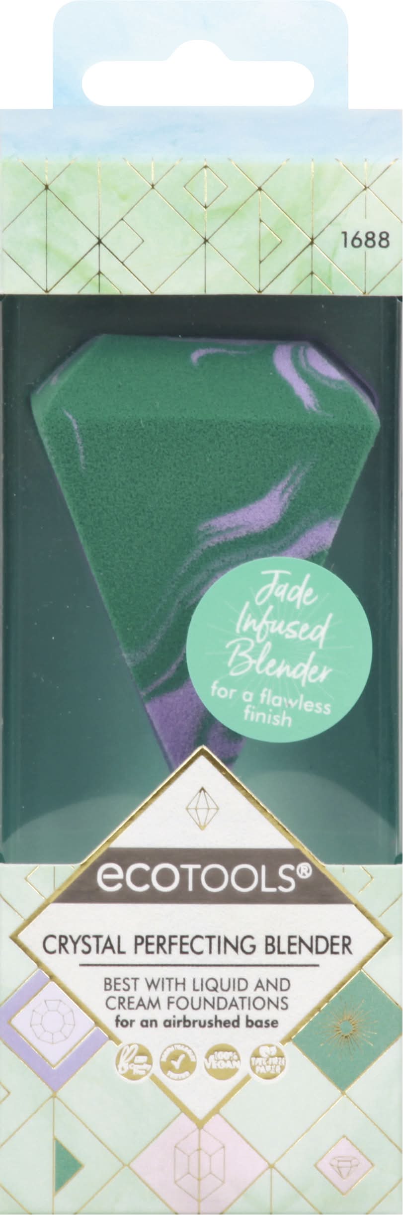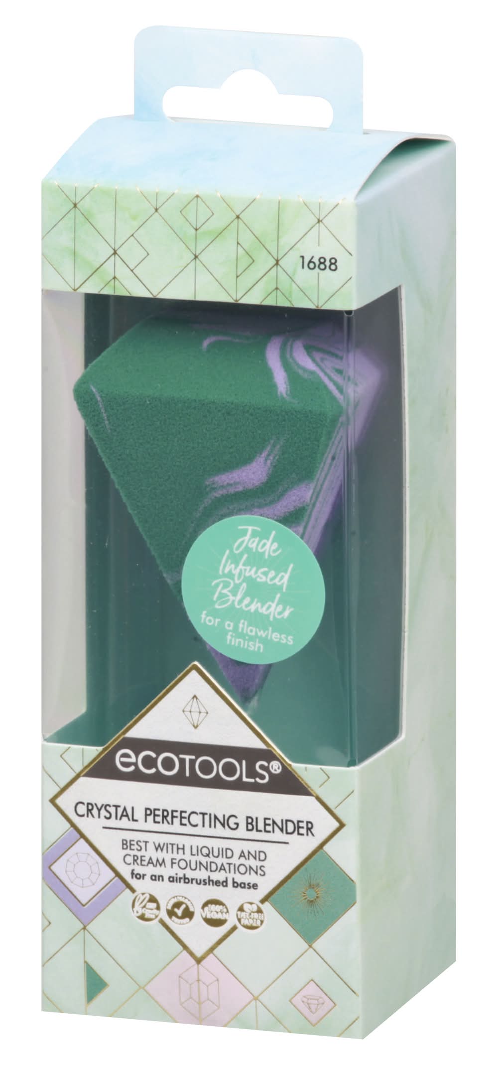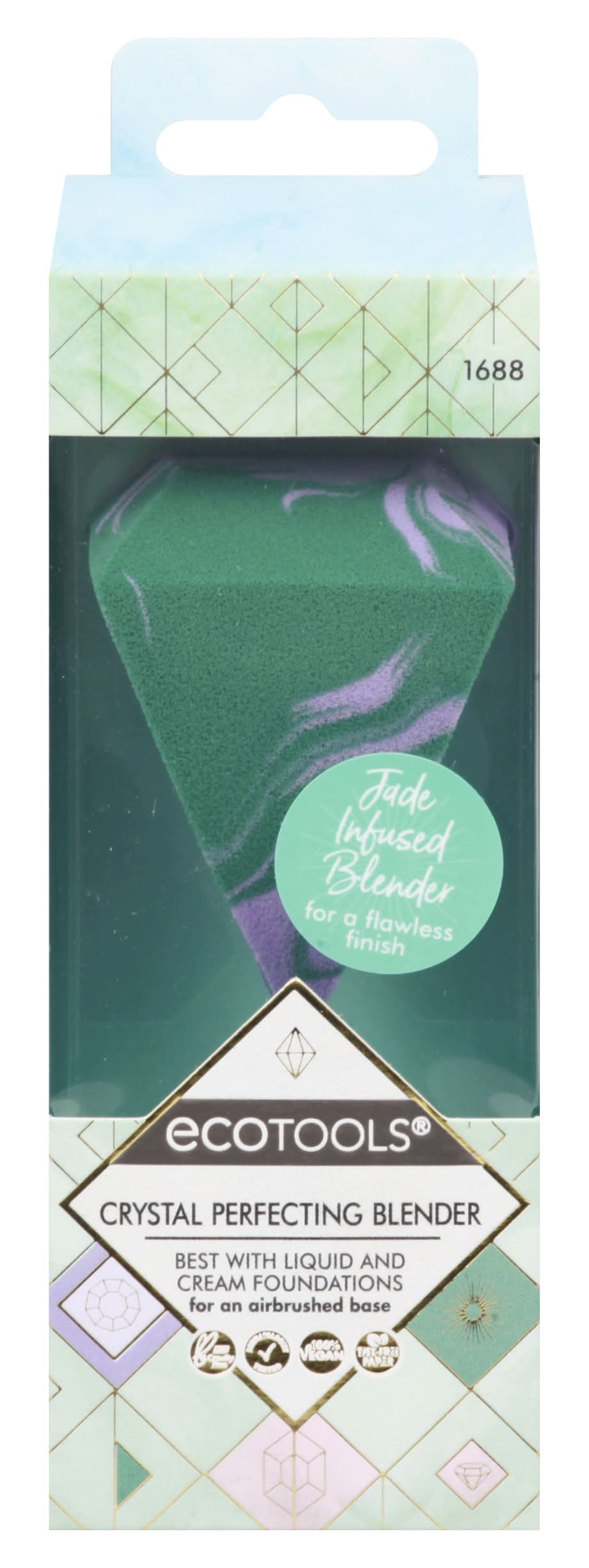100% vegan. Jade infused blender. For a flawless finish. Best with liquid and cream foundations for an airbrushed base. The crystal perfecting blender is designed with Ecofoam technology to blend primer and foundation for flawless looking skin. Use sponge wet or dry. My inner light shines for all of those to see. Facebook. Instagram. Twitter. Pinterest. YouTube. (hashtag)EcoToolsXO. PETA: Cruelty free. Tree-free paper. Made in China. Paris Presents Incorporated,