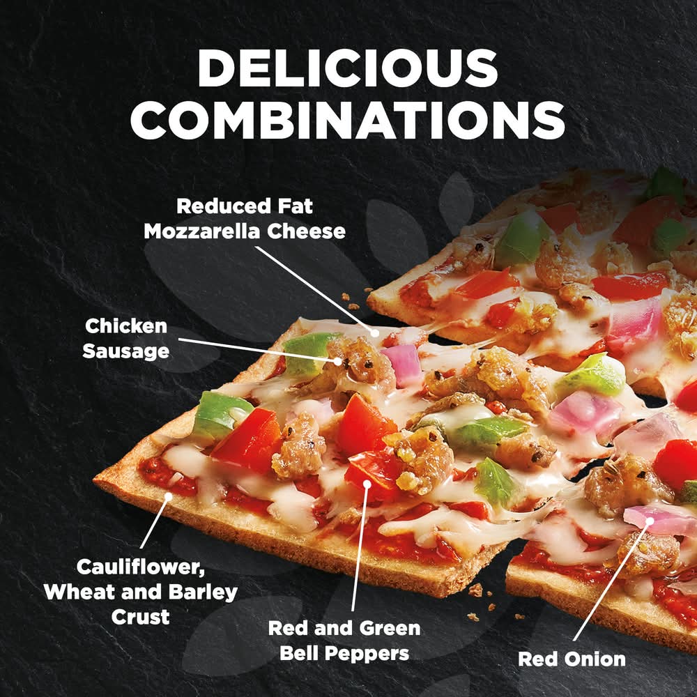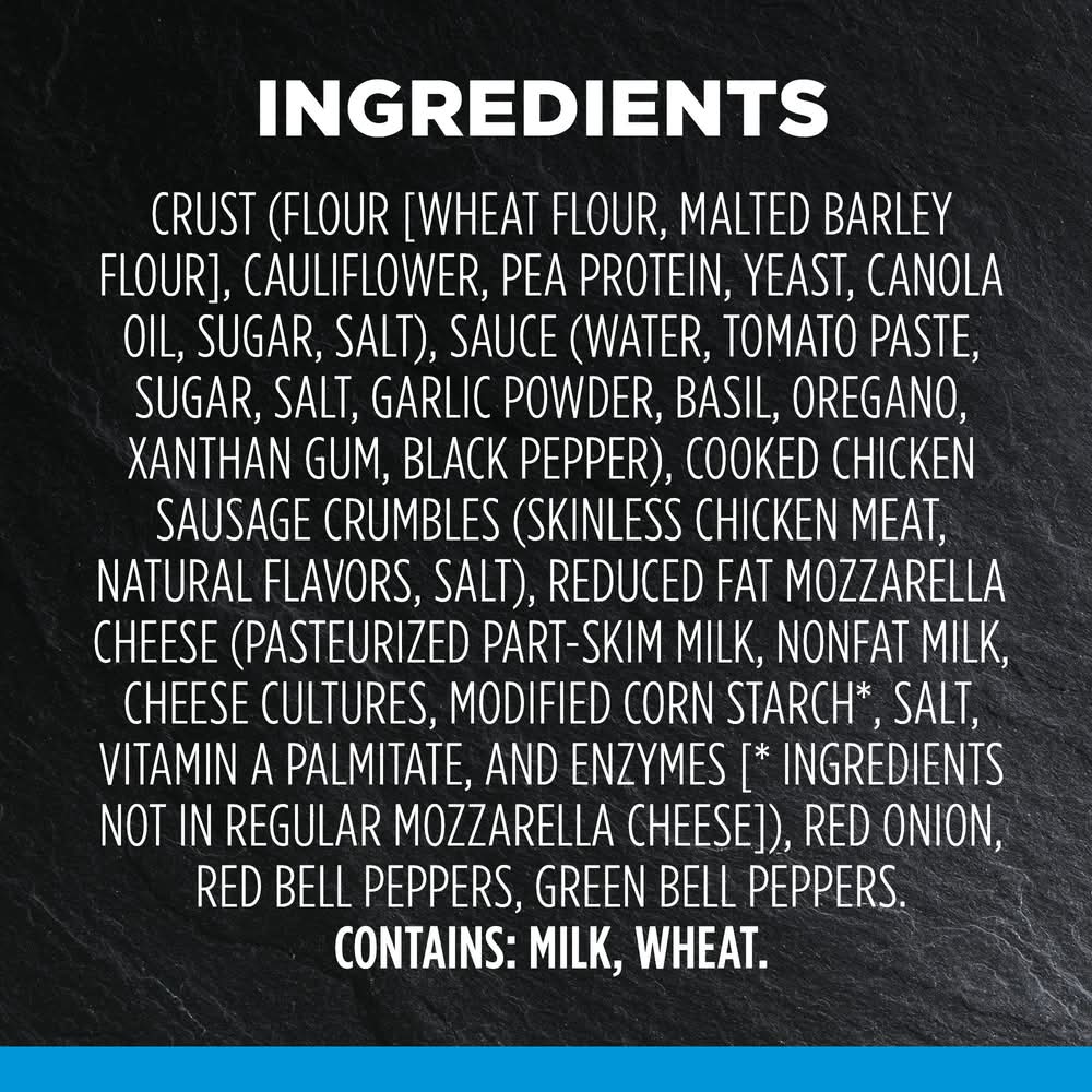 Crust (Flour [Wheat Flour, Malted Barley Flour], Cauliflower, Pea Protein, Yeast, Canola Oil, Sugar, Salt), Sauce (Water, Tomato Paste, Sugar, Salt, Garlic Powder, Basil, Oregano, Xanthan Gum, Black Pepper), Cooked Chicken Sausage Crumbles (Skinless Chicken Meat, Natural Flavors, Salt), Reduced Fat Mozzarella Cheese (Pasteurized Part-Skim Milk, Nonfat Milk, Cheese Cultures, Modified Corn Starch (No Artificial Ingredients, Minimally Processed), Salt, Vitamin A Palmitate, and Enzymes [(No Artificial Ingredients, Minimally Processed) Ingredients Not in Regular Mozzarella Cheese]), Red Onion, Red Bell Peppers, Green Bell Peppers. Contains: Wheat, Milk, Barley, Corn