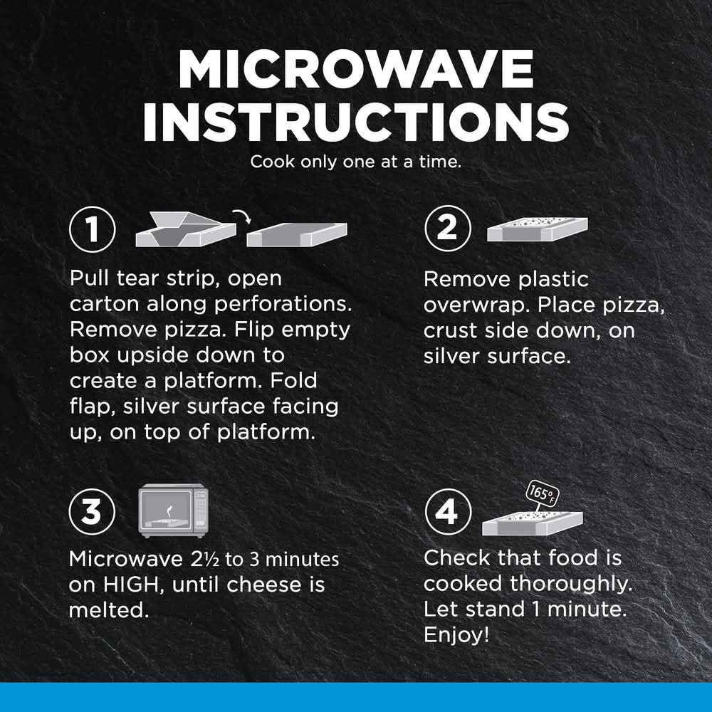 Directions for use: Directions: Must be cooked thoroughly. For Food Safety and Quality: Keep frozen. Do not thaw. Microwave directions developed with 1100-watt microwave ovens. Appliances vary. Adjust cooking times as needed. Food must be cooked thoroughly to 165 degrees F. Read and follow these cooking directions. Microwave Oven: Cook only one at a time. 1. Pull tear strip, open carton along perforations. Remove pizza. Flip empty box upside down to create a platform. Fold flap, silver surface facing up, on top of platform. 2. Remove plastic overwrap. Place pizza, crust side down, on silver surface. 3. Microwave 3 minutes to 4 minutes on high, until cheese is melted. 4. Check that food is cooked thoroughly. Let stand 1 minute. Enjoy! Conventional oven: do not prepare in toaster oven. Place oven rack in center of the oven. Preheat oven to 400 degrees F. Remove pizza from carton and overwrap. Cook on baking sheet in center of oven 15 to 17 minutes. Check that food is cooked thoroughly. Careful, it's hot! Let stand 2 minutes! Keep frozen. Tear to open. Storage recommendation: Keep frozen.