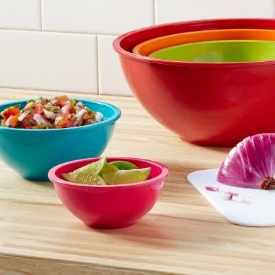 Mix it up with the colorful Room Essentials Mixing Bowl Set. These mixing bowls are fun and fresh in vibrant colors. They will add a pop of color to your everyday meals. They also nest nicely together for convenient storage. The smooth plastic material is dishwasher safe. With this great set, you will have the perfect sized mixing bowl for every job in the kitchen. Color: Assorted