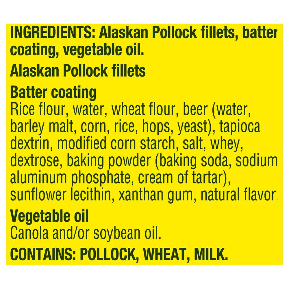 Ingredients: Pollock Fillets, Batter Coating, Canola Oil Pollock Fillets: (Pollock, Sodium Tripolyphosphate (to Retain Fish Moisture)). Batter Coating (Rice Flour, Water, Wheat Flour, Beer (Water, Barley Malt, Corn, Rice, Hops, Yeast), Tapioca Dextrin, Modified Corn Starch, Salt, Whey, Dextrose, Baking Powder (Baking Soda, Sodium Aluminum Phosphate), Sunflower Lecithin, Xanthan Gum, Natural Flavor). Canola Oil. Contains: Contains: Pollock, Wheat, Milk