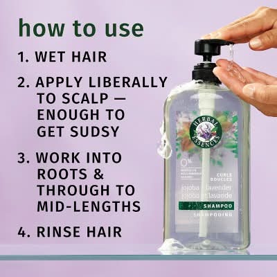 Herbal Essences Jojoba Oil & Lavender Curls Shampoo is formulated to nurture, smooth, and protect hair from damage while giving curls a soft and smooth feel. This shampoo features an infused blend of jojoba oil, lavender, and aloe vera, which helps to surround each hair strand with moisture and nutrients. It is dermatologist-tested and free of minerals and silicone. The product is certified PETA cruelty-free, indicating it is not tested on animals. For optimal results, it is suggested to apply the shampoo generously, lather, then rinse, and follow with Herbal Essences' Conditioner.