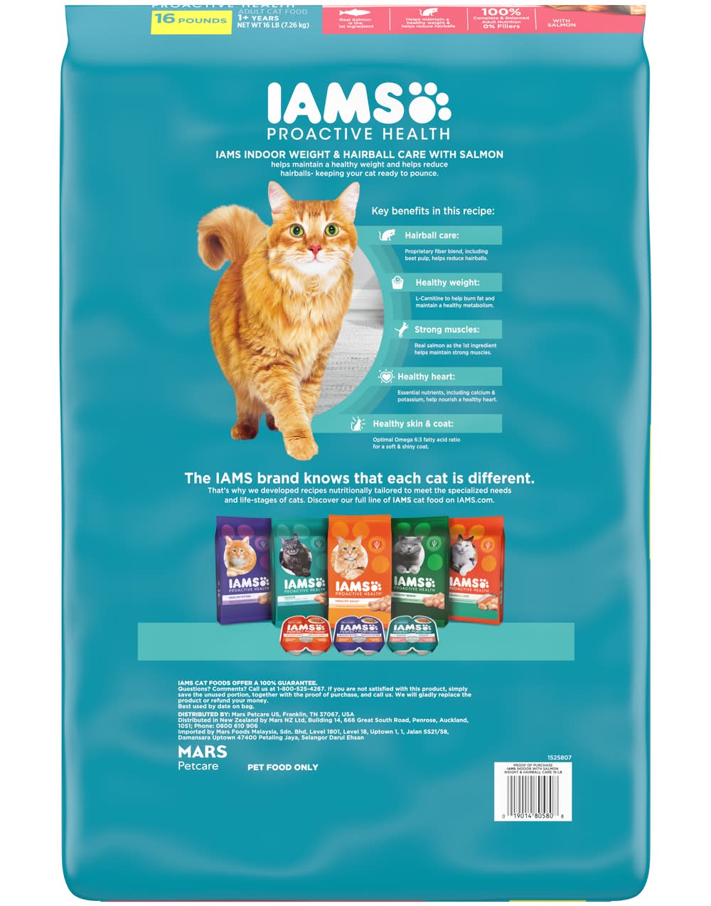 Help keep your cats at their best with IAMS PROACTIVE HEALTH Adult Indoor Weight Hairball Care Dry Cat Food with Salmon. This kibble recipe is designed to provide your cat with the nutrients they need and assist with weight management and hairball control. Help your cat sustain a healthy weight with this unique formula, without the loss of flavor. Made with L-carnitine, it helps burn fat and maintain a healthy metabolism. It features a proprietary fiber blend including beet pulp that can help control hairballs. This cat food formula contains the optimal omega 6:3 fatty acid ratio to help your kitty grow and maintain a soft, shiny coat, with real salmon as the first ingredient. This formula is full of essential vitamins and nutrients, including vitamin E to help maintain a strong immune system. Plus, it nourishes heart health with calcium and potassium. Your cat will be eager to get their paws on this purr-fect fish cat food formula, and you can rest easy knowing you’re feeding them a meal that contributes to healthy nutrition.