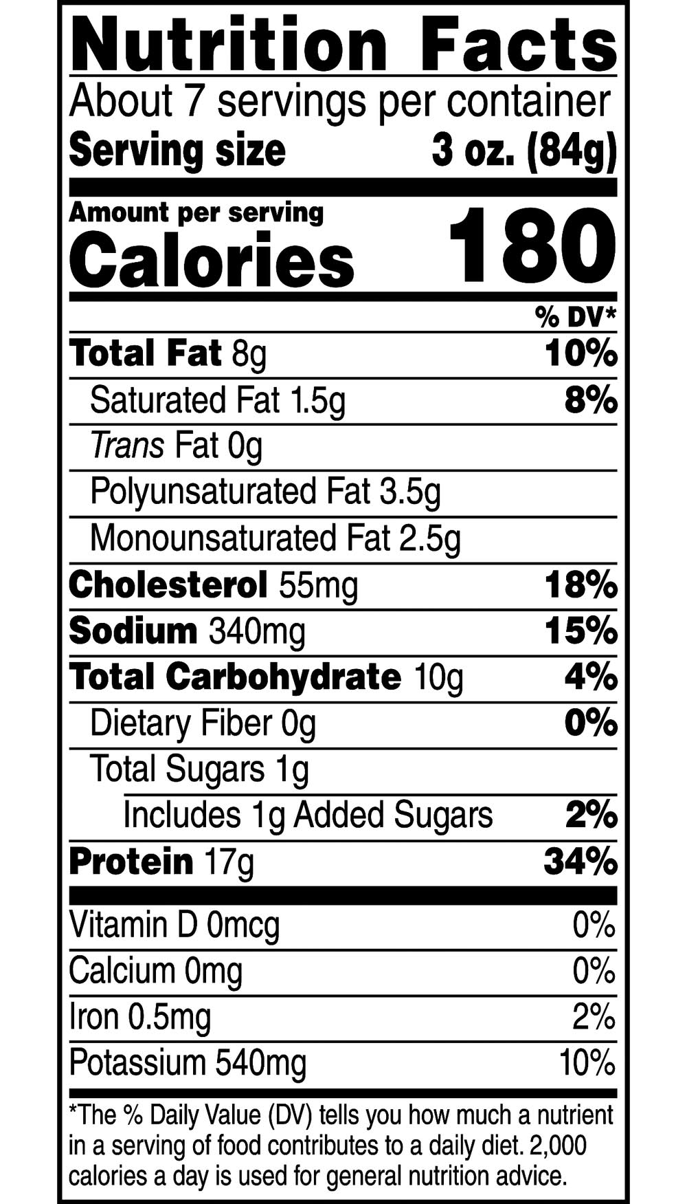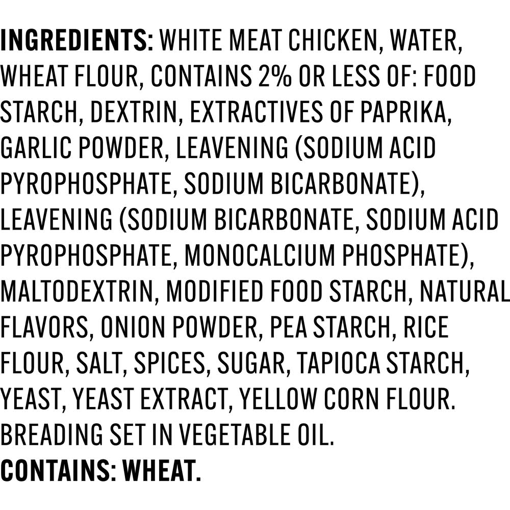 Ingredients: White meat chicken, wheat flour, water, chicken broth, contains 2% or less of: black pepper, brown sugar, chicken fat, dried chicken broth, dried garlic, dried onion, food starch, lemon juice concentrate, sage, salt, spices (black pepper), sugar, thyme, yeast. Breading set in vegetable oil. Contains: Wheat
