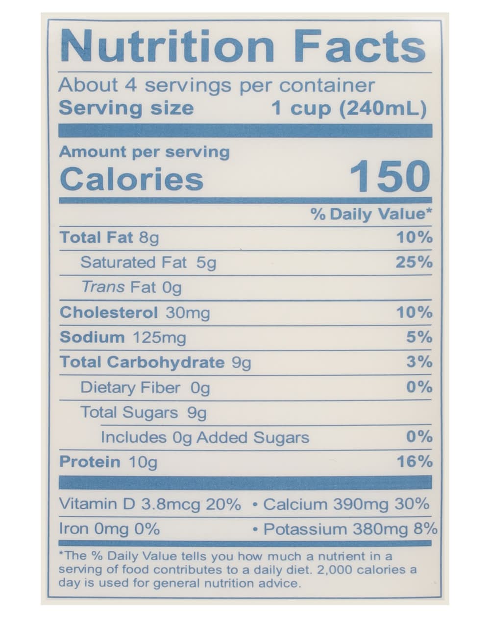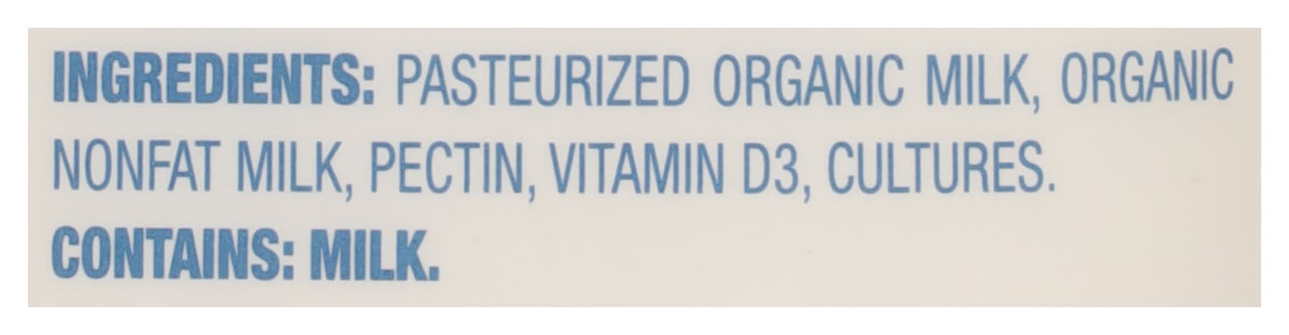 Ingredients: Pasteurized Organic Milk, Organic Nonfat Milk, Pectin, Vitamin D3, Cultures Contains: Milk