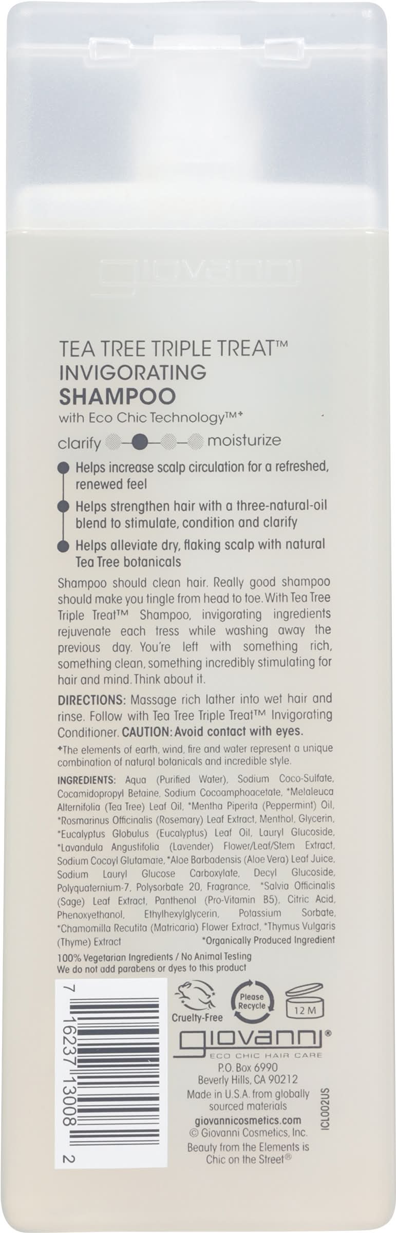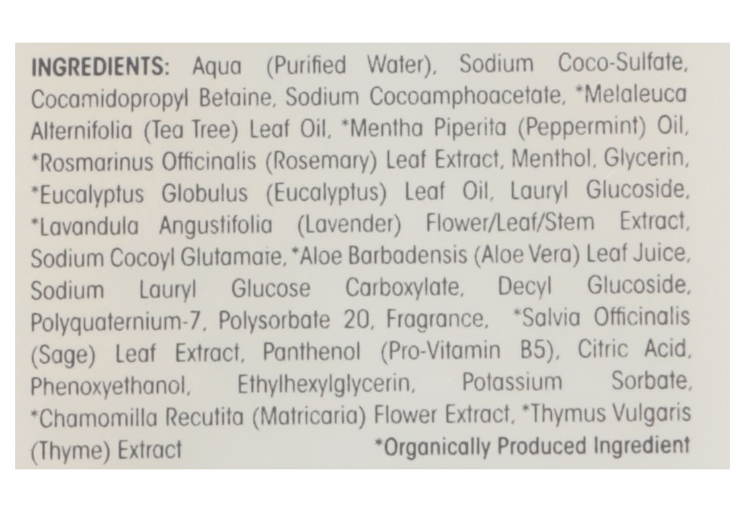 Ingredients: Aqua (Purified Water), Sodium Coco-Sulfate, Cocamidopropyl Betaine, Sodium Cocoamphoacetate, *Melaleuca Alternifolia (Tea Tree) Leaf Oil, *Mentha Piperita (Peppermint) Oil, *Rosmarinus Officinalis (Rosemary) Leaf Extract, Menthol, Glycerin, *Eucalyptus Globulus (Eucalyptus) Leaf Oil, Lauryl Glucoside, *Lavandula Angustifolia (Lavender) Flower/Leaf/Stem Extract, Sodium Cocoyl Glutamate, *Aloe Barbadensis (Aloe Vera) Leaf Juice, Sodium Lauryl Glucose Carboxylate, Decyl Glucoside, Polyquaternium-7, Polysorbate 20, Fragrance, *Salvia Officinalis (Sage) Leaf Extract, Panthenol (Pro-Vitamin B5), Citric Acid, Phenoxyethanol, Ethylhexylglycerin, Potassium Sorbate, *Chamomilla Recutita (Matricaria) Flower Extract, *Thymus Vulgaris (Thyme) Extract. *Organically Produced Ingredient