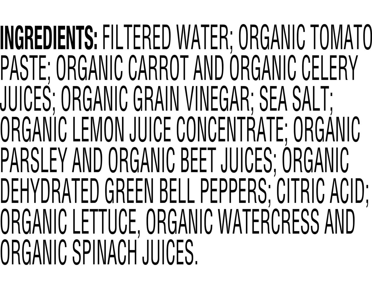 Filtered Water; Organic Tomato Paste; Organic Carrot And Organic Celery Juices; Organic Grain Vinegar; Sea Salt; Organic Lemon Juice Concentrate; Organic Parsley And Organic Beet Juices; Organic Dehydrated Green Bell Peppers; Citric Acid; Organic Lettuce, Organic Watercress And Organic Spinach Juices. Contains: None Additives: None