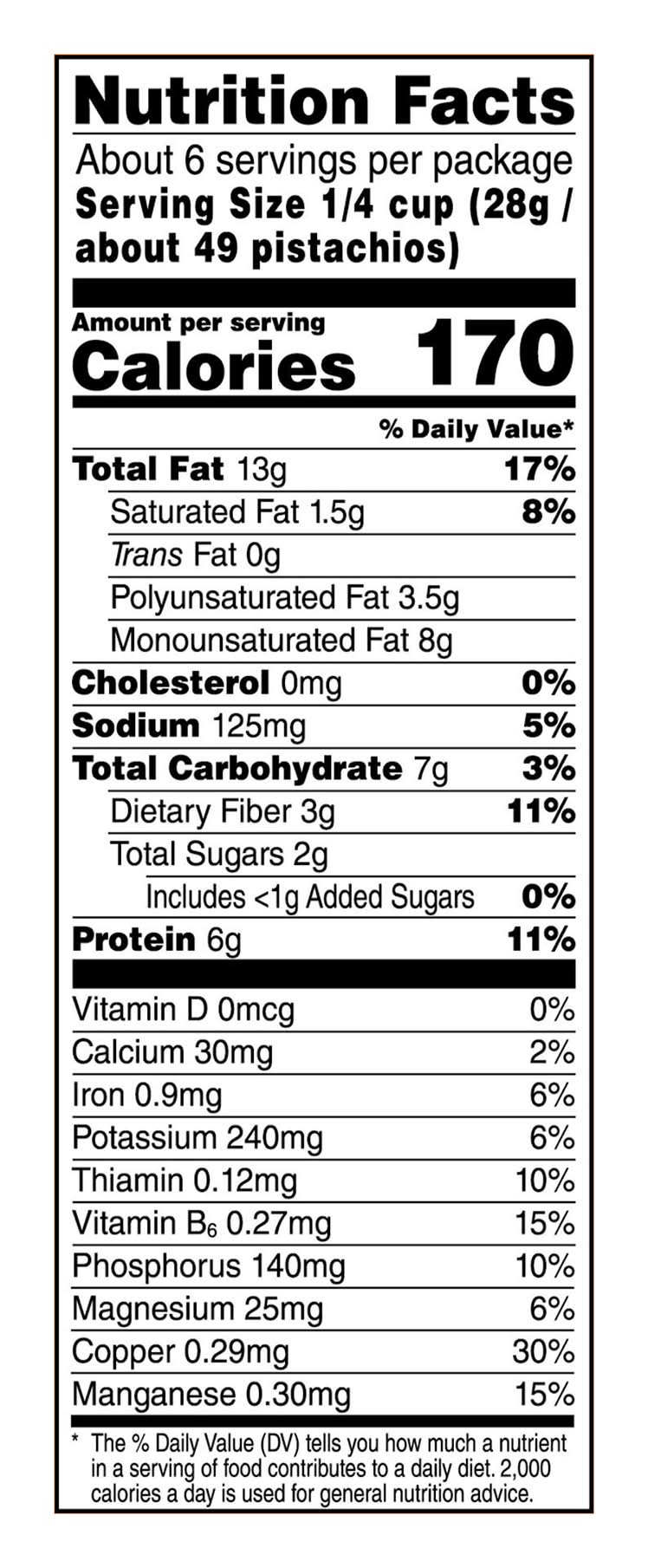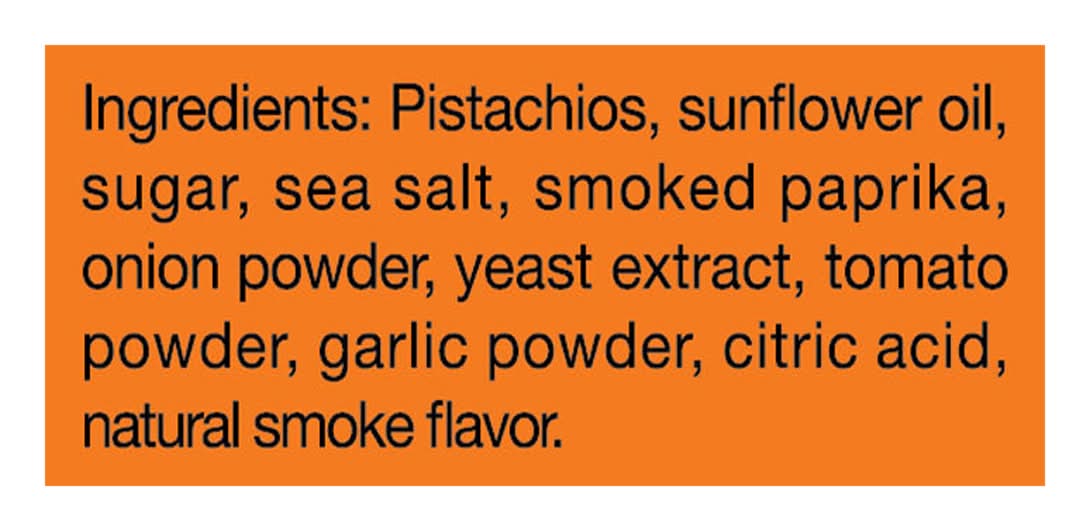 Ingredients: Pistachios, Sunflower Oil, Sugar, Sea Salt, Smoked Paprika, Onion Powder, Yeast Extract, Tomato Powder, Garlic Powder, Citric Acid, Natural Smoke Flavor Contains: Tree Nuts, Pistachios