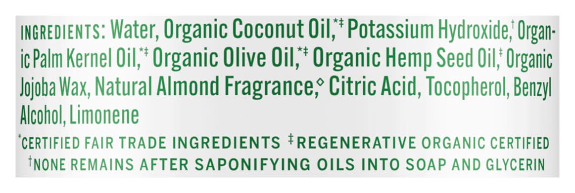 Water, Organic Coconut Oil*(a), Potassium Hydroxide(b), Organic Palm Kernel Oil*(a), Organic Olive Oil*(a), Organic Hemp Seed Oil(a), Organic Jojoba Wax, Natural Almond Fragrance(c), Citric Acid, Tocopherol, Benzyl Alcohol, Limonene. *Certified Fair Trade Ingredients. (a)Regenerative Organic Certified. (b)None Remains After Saponifying Oils Into Soap and Glycerin. (c)Fragrance Ingredients Include Benzaldehyde Contains: Tree Nuts, Almonds Additives: None