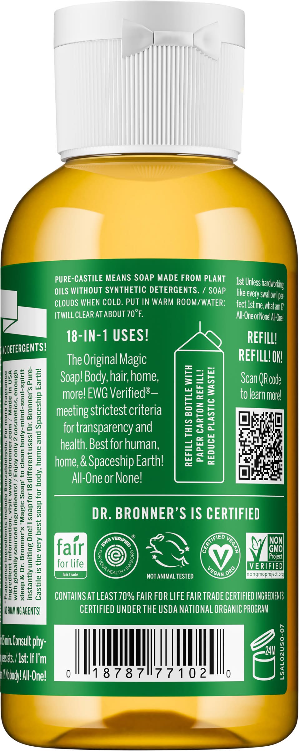 Enjoy only 2 cosmetics, enough sleep & Dr. Bronner's magic soap to clean body-mind-soul-spirit instantly uniting one! For facial packs, scalps & soothing body rub, add dash on bath towel in sink of hot water. Wring out. Lay over face & scalp. Massage with fingertips. Repeat 3 or 4 times til arms, legs & all are rubbed, always towards the heart! Dilute: Enjoy 1 soap for 18 different uses! Shave-shampoo-shower-bath-mop-launder-degrease! Dr. Bronner's pure-castile is the very best soap for body, home and spaceship earth! Synthetic preservatives? Detergents? Foaming agents? None! Teach the Moral ABC uniting all free in the shepherd-astronomer Israel's greatest all-one-god-faith! Good for 24 months once opened.