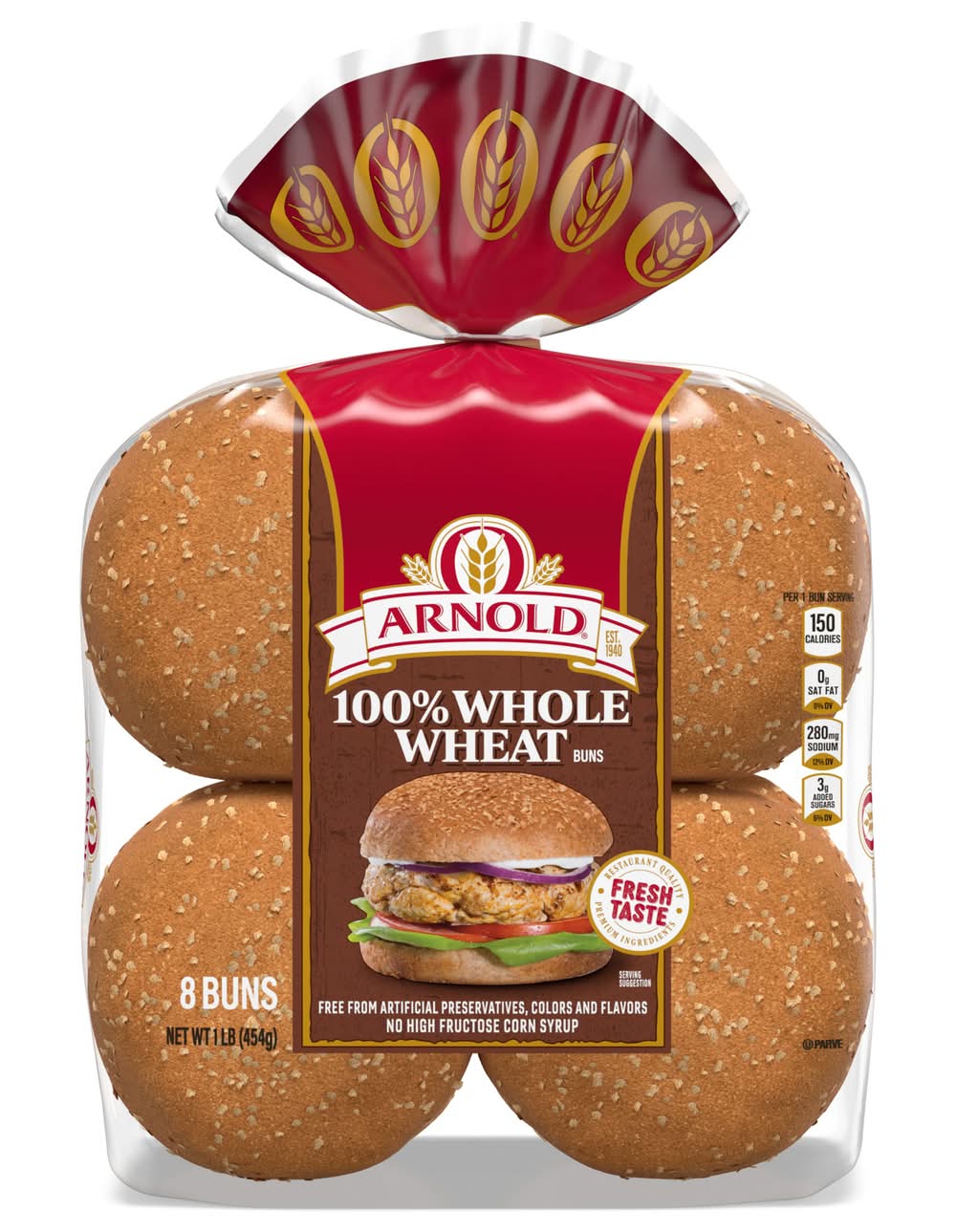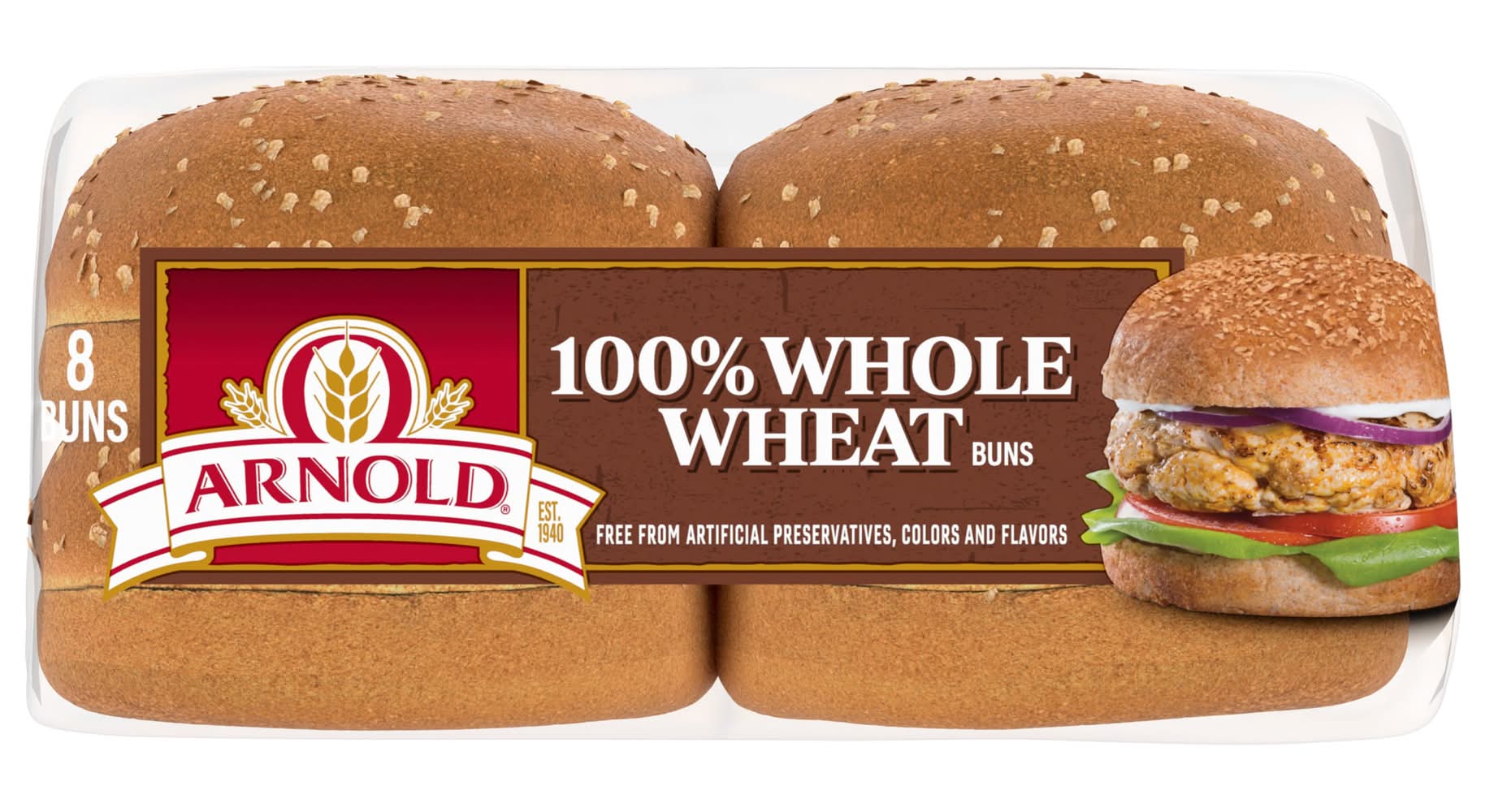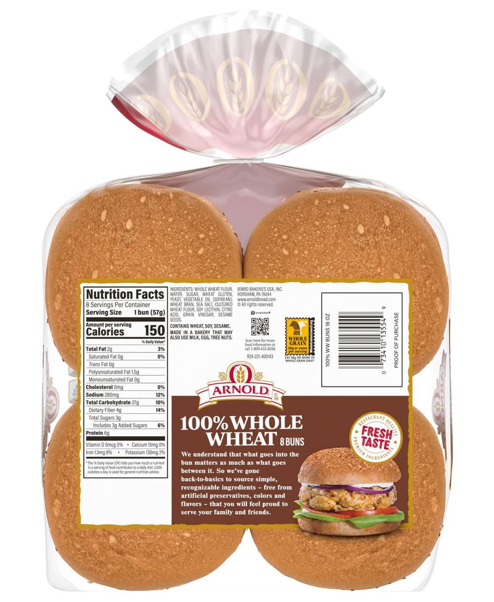 Arnold 100% Whole Wheat 8 count Buns are bursting with flavor and nutrients. Every freshly baked bun is free from artificial flavors, colors, and preservatives and has no high-fructose corn syrup, baked only with premium ingredients. Bimbo Bakeries USA, Inc., Horsham,PA,19044