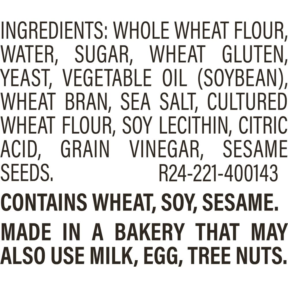 WHOLE WHEAT FLOUR, WATER, SUGAR, WHEAT GLUTEN, YEAST, VEGETABLE OIL (SOYBEAN), WHEAT BRAN, SEA SALT, CULTURED WHEAT FLOUR, SOY LECITHIN, CITRIC ACID, GRAIN VINEGAR, SESAME SEEDS. Contains: CONTAINS SESAME, SOY, WHEAT.