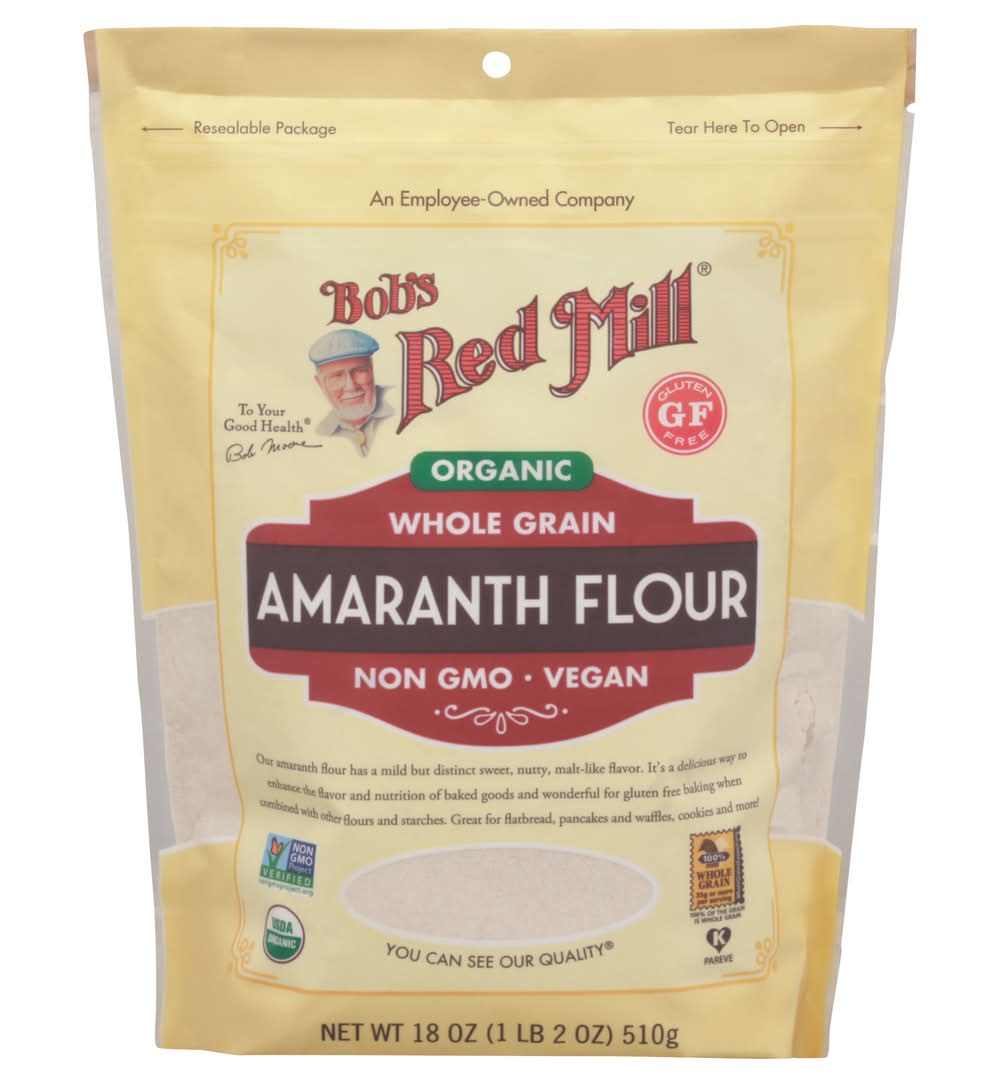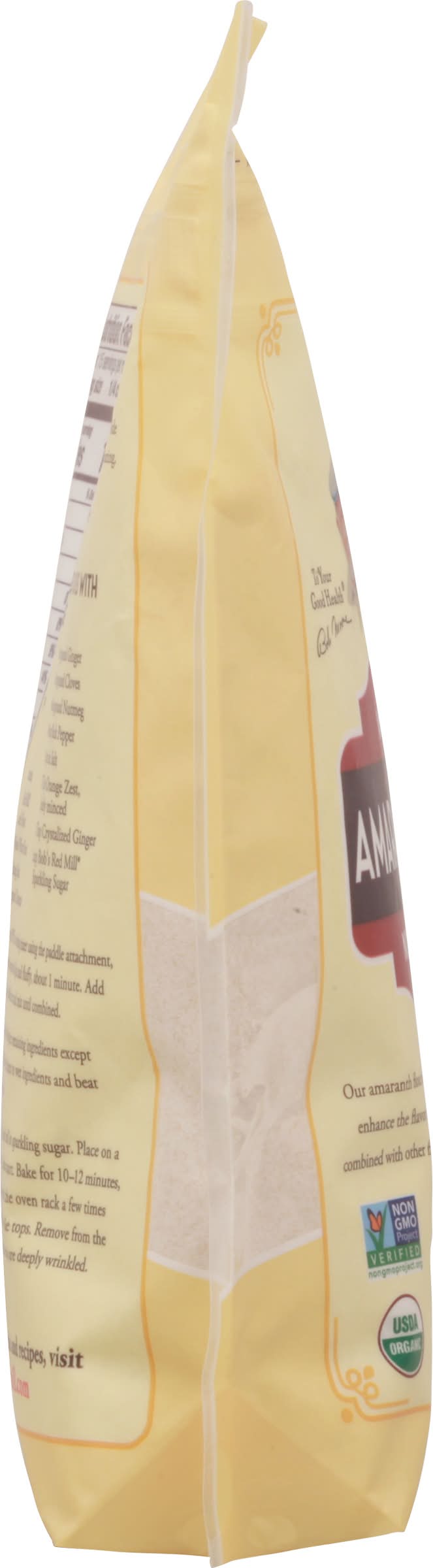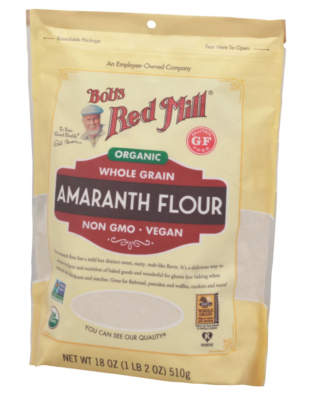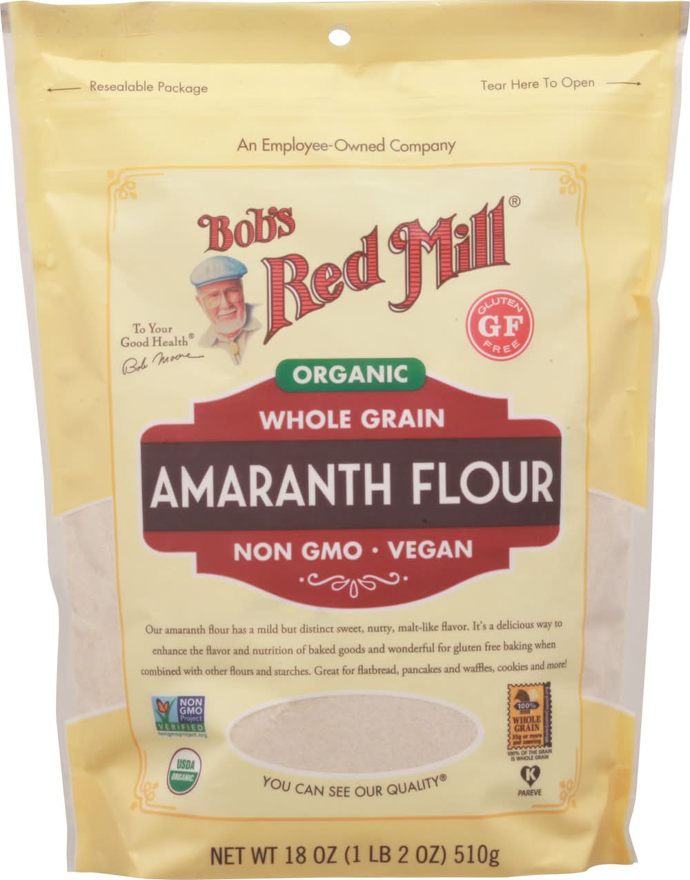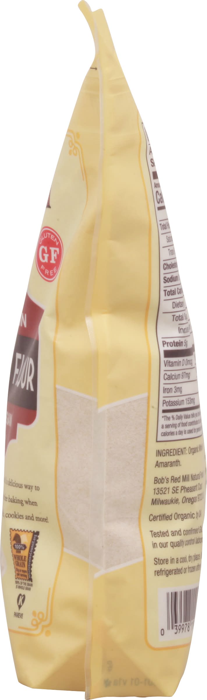 USDA Organic. 100% Whole Grain 35 g or more per serving 100% of the grain is Whole Grain WholeGrainsCouncil.org. GF-Gluten free. Certified Organic by QAI. Tested and confirmed gluten free in our quality control laboratory. Non GMO Project verified. nongmoproject.org. An Employee-owned company. Our amaranth flour has a mild but distinct sweet, nutty, malt-like flavor. It's a delicious way to enhance the flavor and nutrition of baked goods and wonderful for gluten free baking when combined with other flours and starches. Great for &thread, pancakes and waffles, cookies and more! You can see our quality. Dear friends. At Bob's Red Mill, sic take great pleasure in bringing wholesome foods like organic amaranth flour to your table. We search the world for unique and unusual heirloom grains that you can use to forge new culinary adventures-right in your own kitchen! Rely on us for a wide variety of baking flours, grains and mixes you'll feel good about eating. To your good health. bobsredmill.com. For information and recipes, visit bobsredmill.com. Resealable package. • Bob's Red Mill Natural Foods, Inc., • Packaging: Reusable