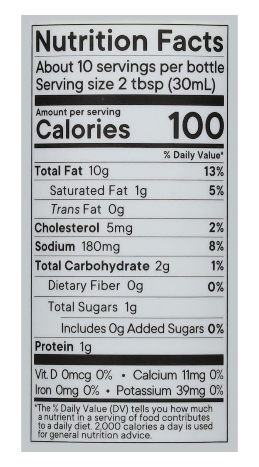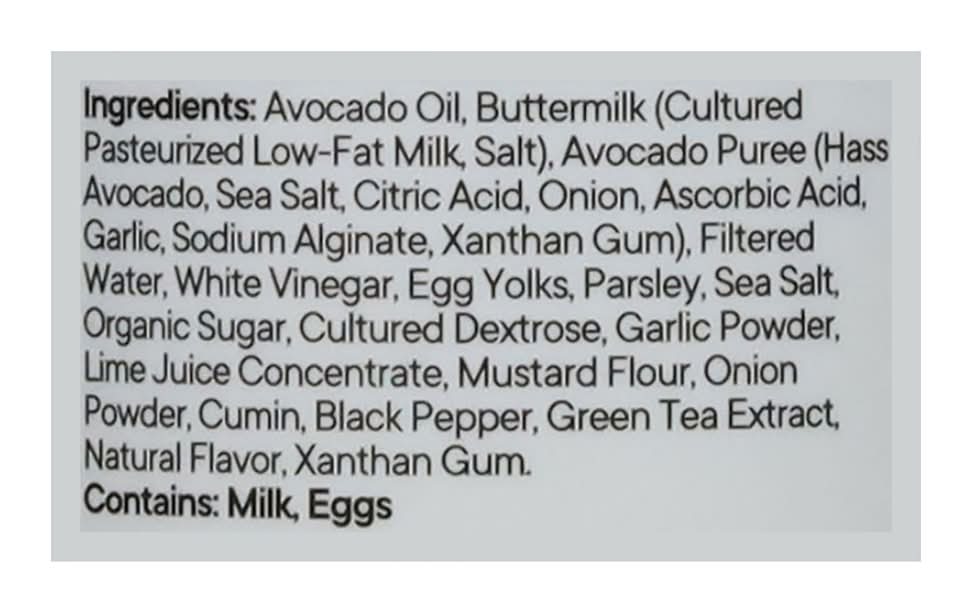 Avocado Oil, Buttermilk (Cultured Pasteurized Low-Fat Milk, Salt), Avocado Puree (Hass Avocado, Sea Salt, Citric Acid, Onion, Ascorbic Acid, Garlic, Sodium Alginate, Xanthan Gum), Filtered Water, White Vinegar, Egg Yolks, Parsley, Sea Salt, Organic Sugar, Cultured Dextrose, Garlic Powder, Lime Juice Concentrate, Mustard Flour, Onion Powder, Cumin, Black Pepper, Green Tea Extract, Natural Flavor, Xanthan Gum Contains: Milk, Eggs, Mustard