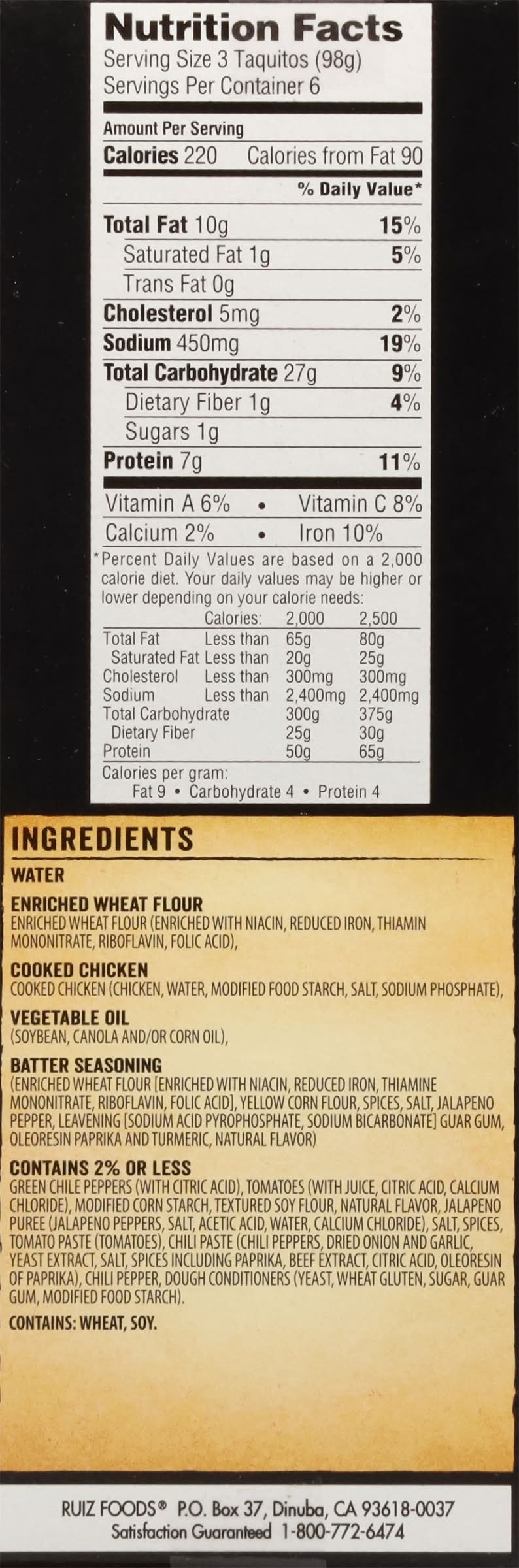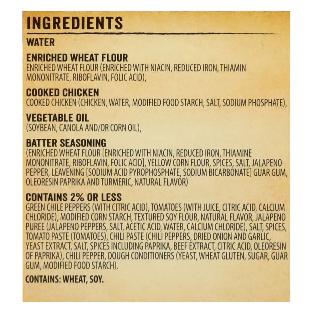 Ingredients: Water: Enriched Wheat Flour: Enriched Wheat Flour (Enriched with Niacin, Reduced Iron, Thiamin Mononitrate, Riboflavin, Folic Acid), Cooked Chicken: Cooked Chicken (Chicken, Water, Modified Food Starch, Salt, Sodium Phosphate), Vegetable Oil: (Soybean, Canola and/or Corn Oil), Batter Seasoning: (Enriched Wheat Flour [Enriched with Niacin, Reduced Iron, Thiamine Mononitrate, Riboflavin, Folic Acid], Yellow Corn Flour, Spices, Salt, Jalapeno Pepper, Leavening [Sodium Acid Pyrophosphate, Sodium Bicarbonate], Guar Gum, Oleoresin Paprika and Turmeric, Natural Flavor), Contains 2% or Less: Green Chile Peppers (with Citric Acid), Tomatoes (with Juice, Citric Acid, Calcium Chloride), Modified Corn Starch, Textured Soy Flour, Natural Flavor, Jalapeno Puree (Jalapeno Peppers, Salt, Acetic Acid, Water, Calcium Chloride), Salt, Spices, Tomato Paste (Tomatoes), Chili Paste (Chili Peppers, Dried Onion and Garlic, Yeast Extract, Salt, Spices Including Paprika, Beef Extract, Citric Acid, Oleoresin of Paprika), Chili Pepper, Dough Conditioners (Yeast, Wheat Gluten, Sugar, Guar Gum, Modified Food Starch) Contains: Wheat, Soybeans, Corn, Gluten