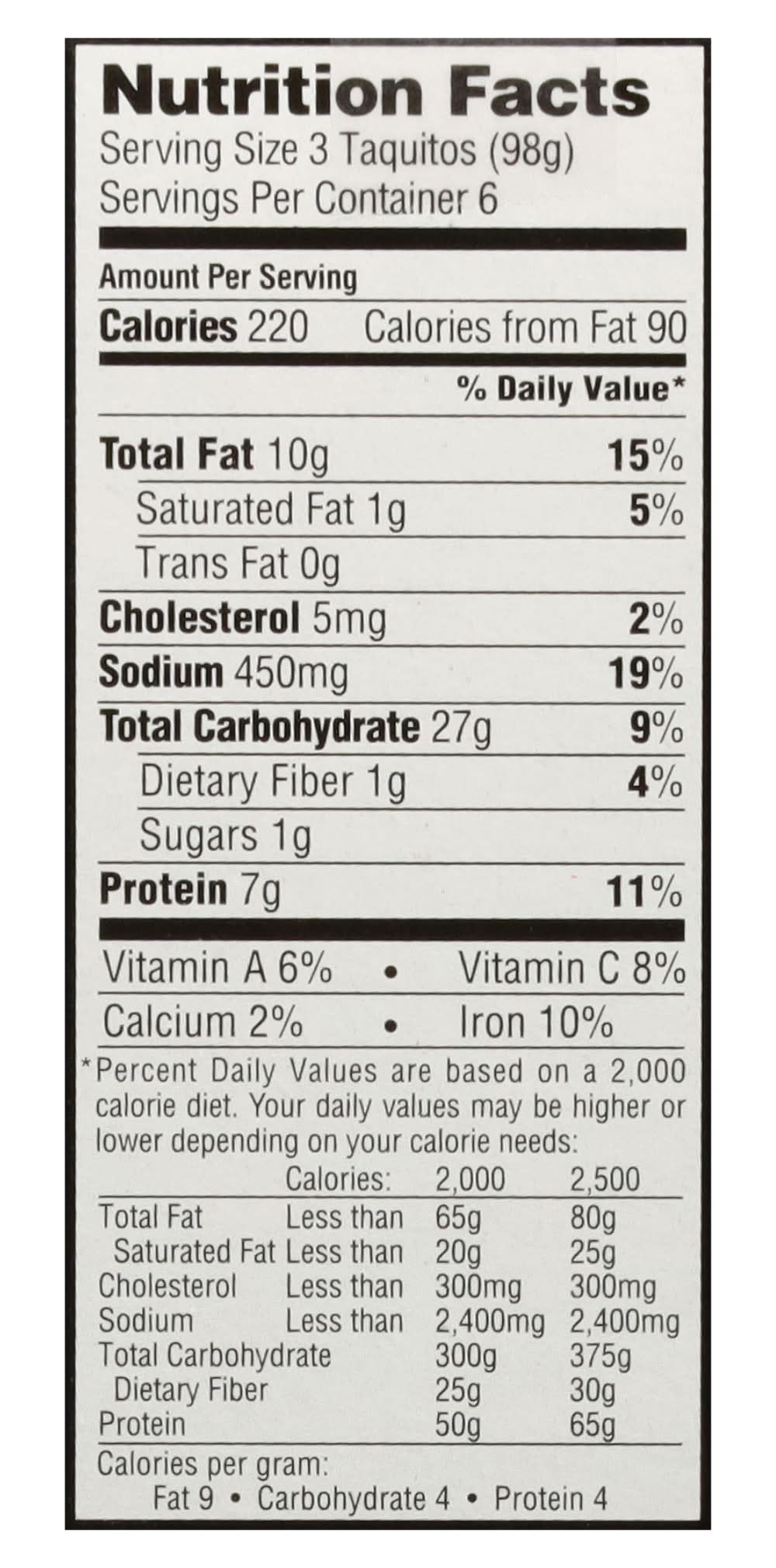 Directions for use: Directions: Cooking Instructions - Bake for crispier texture. Oven: Preheat oven to 400 degrees F. Spread 6 taquitos evenly 1 inch apart on baking sheet lined with parchment paper. Frozen: 10 minutes. Let taquitos stand for 1 minute before eating. Air Fryer: 380 degrees F. Place 6 taquitos in air fryer basket. Frozen: 6 minutes. Let taquitos stand for 1 minute before eating. Microwave (1,100 watt microwave): Place 3 taquitos on a ceramic plate in the center of microwave. Frozen: 1 minute 15 seconds let taquitos stand for 1 minute before eating. For food safety and quality, internal product temperature must reach 165 degrees F. since ovens and microwaves may require adjusting. Caution: product may be hot. Keep frozen. Storage recommendation: Keep frozen.
