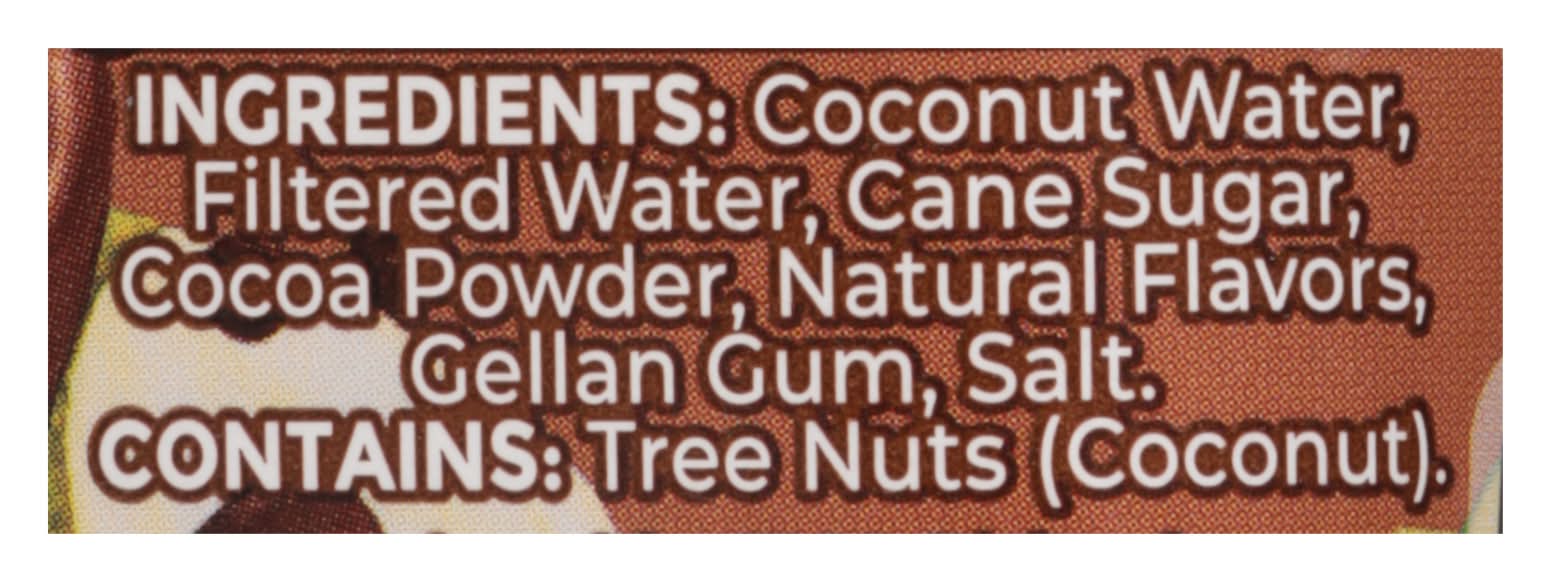 Coconut Water, Filtered Water, Cane Sugar, Cocoa Powder, Natural Flavors, Gellan Gum, Salt Contains: Tree Nuts, Coconuts