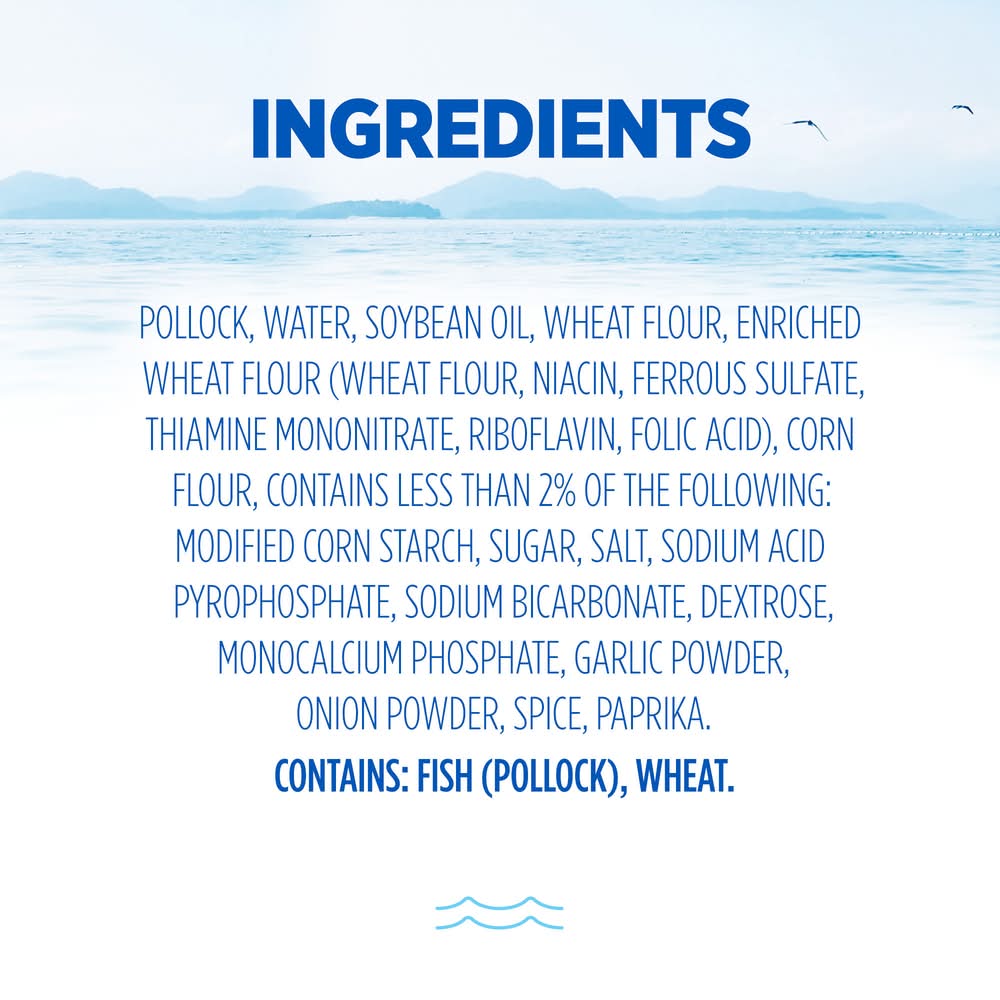 Ingredients: INGREDIENTS: POLLOCK (FISH, SODIUM TRIPOLYPHOSPHATE TO RETAIN FISH MOISTURE), WATER, WHEAT FLOUR, COTTONSEED OIL AND, OR SOYBEAN OIL, ENRICHED WHEAT FLOUR (WHEAT FLOUR [ENRICHED WITH NIACIN, FERROUS SULFATE, THIAMINE MONONITRATE, RIBOFLAVIN, FOLIC ACID], SALT, SOYBEAN OIL), CORN FLOUR. CONTAINS 2% OR LESS OF: MODIFIED FOOD STARCH, SUGAR, LEAVENING (SODIUM ACID PYROPHOSPHATE, SODIUM BICARBONATE, MONOCALCIUM PHOSPHATE), SALT, DEXTROSE, GARLIC POWDER, ONION POWDER, SPICE, PAPRIKA. Contains: Fish - any species, Wheat