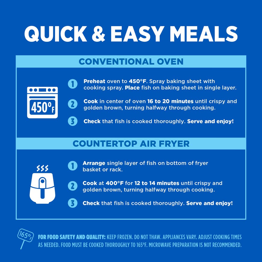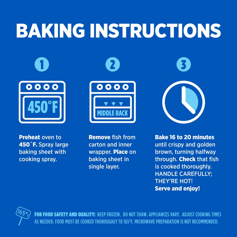 Directions for use: Cook thoroughly. Baking Instructions: 1. Preheat oven 450 degrees F. Spray large baking sheet with cooking spray. 2. Remove fish from carton and inner wrapper. Place on baking sheet in single layer. 3. Bake 16 to 20 minutes until crispy and golden brown, turning halfway through. Check that fish is cooked thoroughly. Handle carefully; They're hot! Serve and enjoy! For Food Safety and Quality: Keep frozen. Do not thaw. Appliances vary. Adjust cooking times as needed. Food must be cooked thoroughly to 165 degrees F. Microwave preparations in not recommended. Keep frozen. Storage recommendation: Keep frozen.