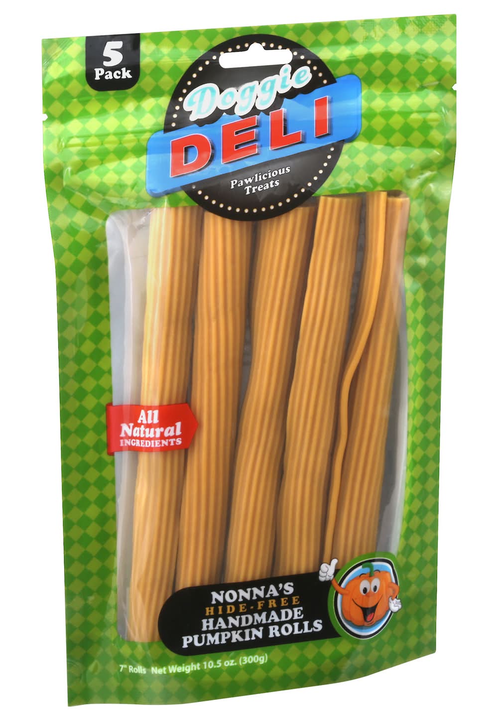 7 inches rolls. Pawlicious treats. Nonna's hide-free handmade pumkin rolls. Nonna's Pumpkin Rolls from Doggie Deli are all natural and made with real pumpkin for a scrumptious taste your dog cannot resist! Vitamin-rich pumpkin contains vitamin A, C, E, potassium, and beta carotene, which can all benefit a dog's health. Plus, these rawhide-free chews are easy to digest and 100% delicious. All the benefits of a rawhide chew -without the rawhide! Treated by irradiation. www.ktrgroupinc.com. Question or comments? Info(at)ktrgroupinc.com. Made in China. Ktr Group,