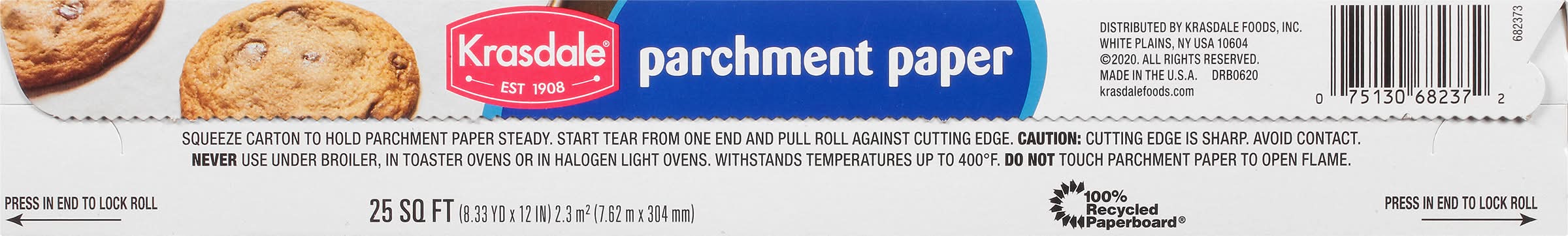 25 sq. ft. (8.33 yd x 12 in). 2.3 sq m (7.62 m x 304 mm). Est. 1908. Great for baking, microwaving, freezing and storing food. krasdalefoods.com. Made in the U.S.A. • Krasdale Foods, • Packaging: Reusable