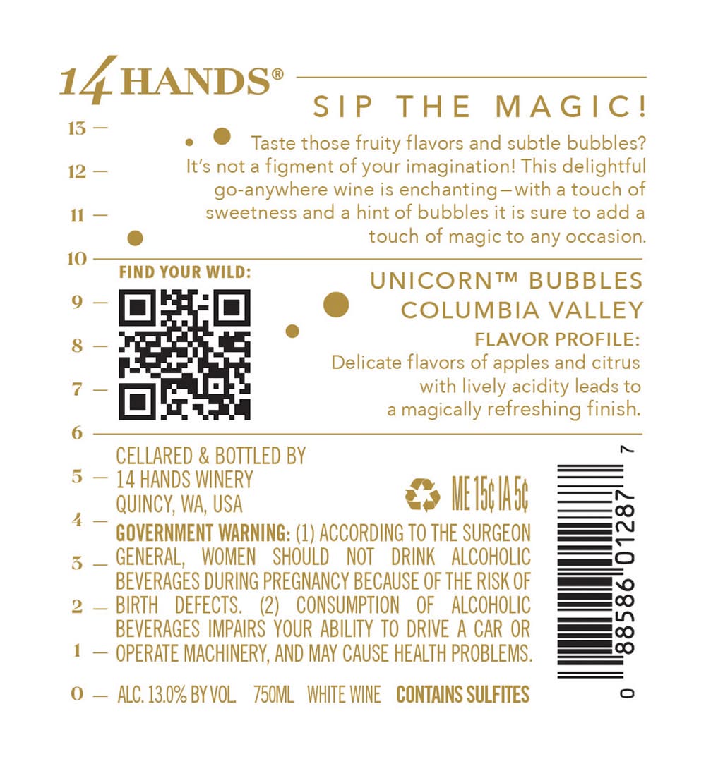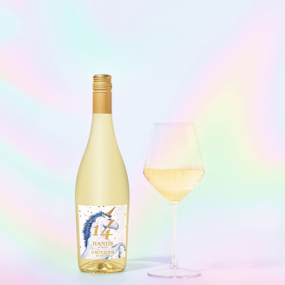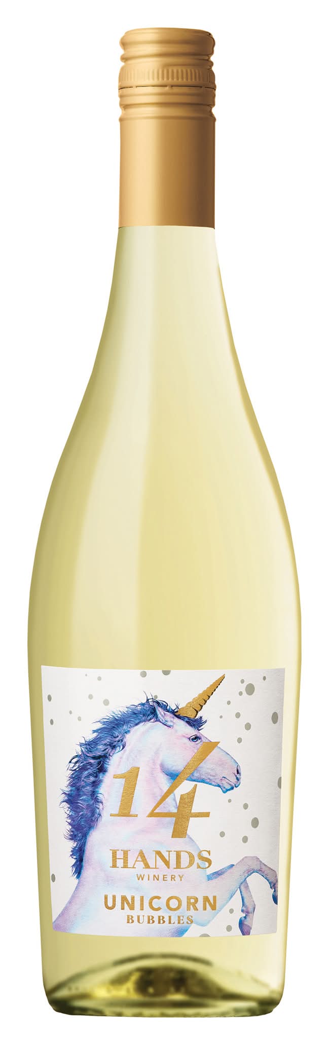 Join us on a magical journey, where fruity flavors and subtle effervescence meet to enchant your tasting experience with this new white wine bubbly from 14 Hands Winery. 14 Hands Unicorn Bubbles Sparkling White Wine is an enticing blend of Chardonnay, Riesling, and Muscat. This aromatic white wine bubbly tantalizes your taste buds with zesty green apple and lemon-lime flavors, wrapped in a bouquet of floral notes and ginger. This go-anywhere white wine is a crowd pleaser that is sure to add a touch of magic to any occasion. Grab a 750 mL bottle of 14 Hands Unicorn Bubbles White Wine, with 13% ABV, and pair it with your favorite snacks like fried spring rolls, baked brie on a baguette, or buttered popcorn for a sensational experience. Inspired by the untamed spirit of the wild horses that once freely roamed eastern Washington, 14 Hands wine represents a reconnection to our wild roots and endless thirst for excitement and fun. The loamy sand and gravel soils of the Columbia Valley require a strong and determined grapevine, and our vineyards revel this world-class terroir. With the fruit from these hardy vines, we handcraft big, fruit-forward reds and crisp, juicy whites. Like the untamed horses we honor with our name, our wild and wonderful wines pack a lot of character into each bottle. Alcohol by volume: 13%