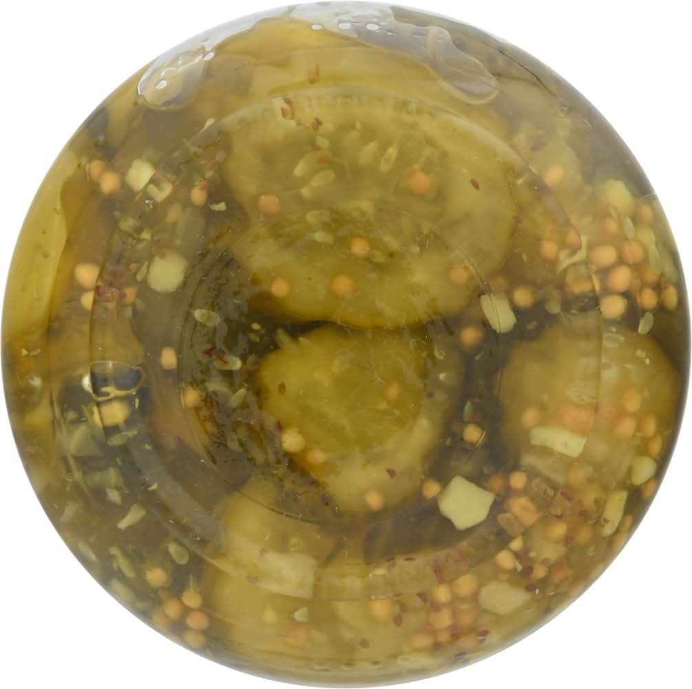 Cucumbers, Sugar, Water, Vinegar, Sea Salt, Dehydrated Garlic, Mustard Seeds, Onion Flakes, Calcium Chloride (Firming Agent), Natural Flavors (Including Natural Smoke Flavors), Celery Seeds, and Carrot and Turmeric Extracts (for Color) Contains: Mustard, Celery