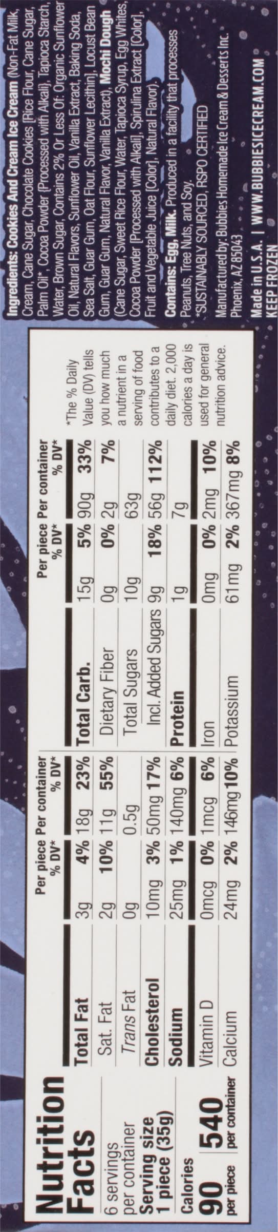 Cookies and Cream Ice Cream (Non-Fat Milk Cream Cane Sugar Chocolate Cookies [Rice Flour Cane Sugar Palm Oil (Sustainably Sourced RSPO Certified), Cocoa Powder {Processed with Alkali}, Tapioca Starch, Water, Brown Sugar, Contains 2% or Less of: Organic Sunflower Oil, Natural Flavors, Sunflower Oil, Vanilla Extract, Baking Soda, Sea Salt, Guar Gum, Oat Flour, Sunflower Lecithin], Locust Bean Gum, Guar Gum, Natural Flavor, Vanilla Extract), Mochi Dough (Cane Sugar Sweet Rice Flour Water Tapioca Syrup Egg Whites Cocoa Powder [Processed with Alkali] Spirulina Extract [Color] Fruit and Vegetable Juice [Color] Natural Flavor) Contains: Milk, Oat, Eggs, Peanuts, Tree Nuts, Soybeans Additives: None